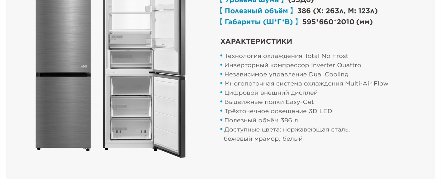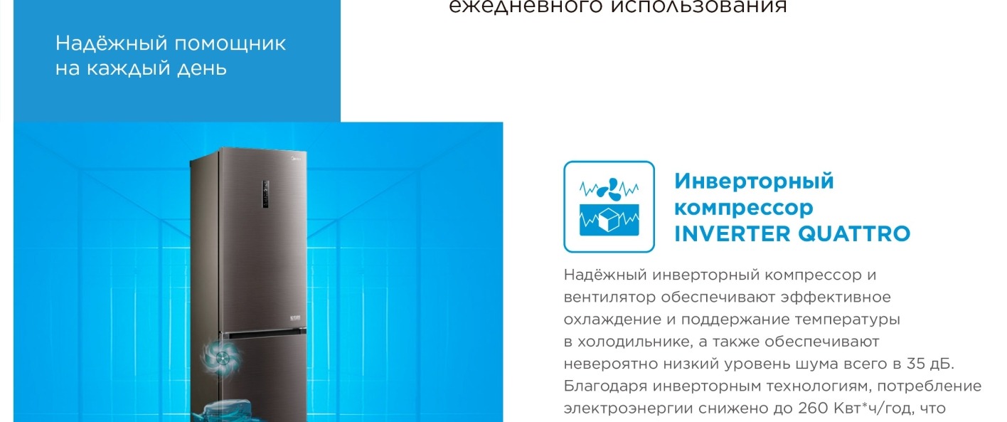 БрендMidea Класс энергоэффективностиА++ Система охлажденияNO FROST Перенавешиваемые двериДа Энергопотребление в год260 кВт·ч/год Количество отделений в морозильной камере3 Полезный объем морозильной камеры123 л Полезный объем холодильной камеры263 л