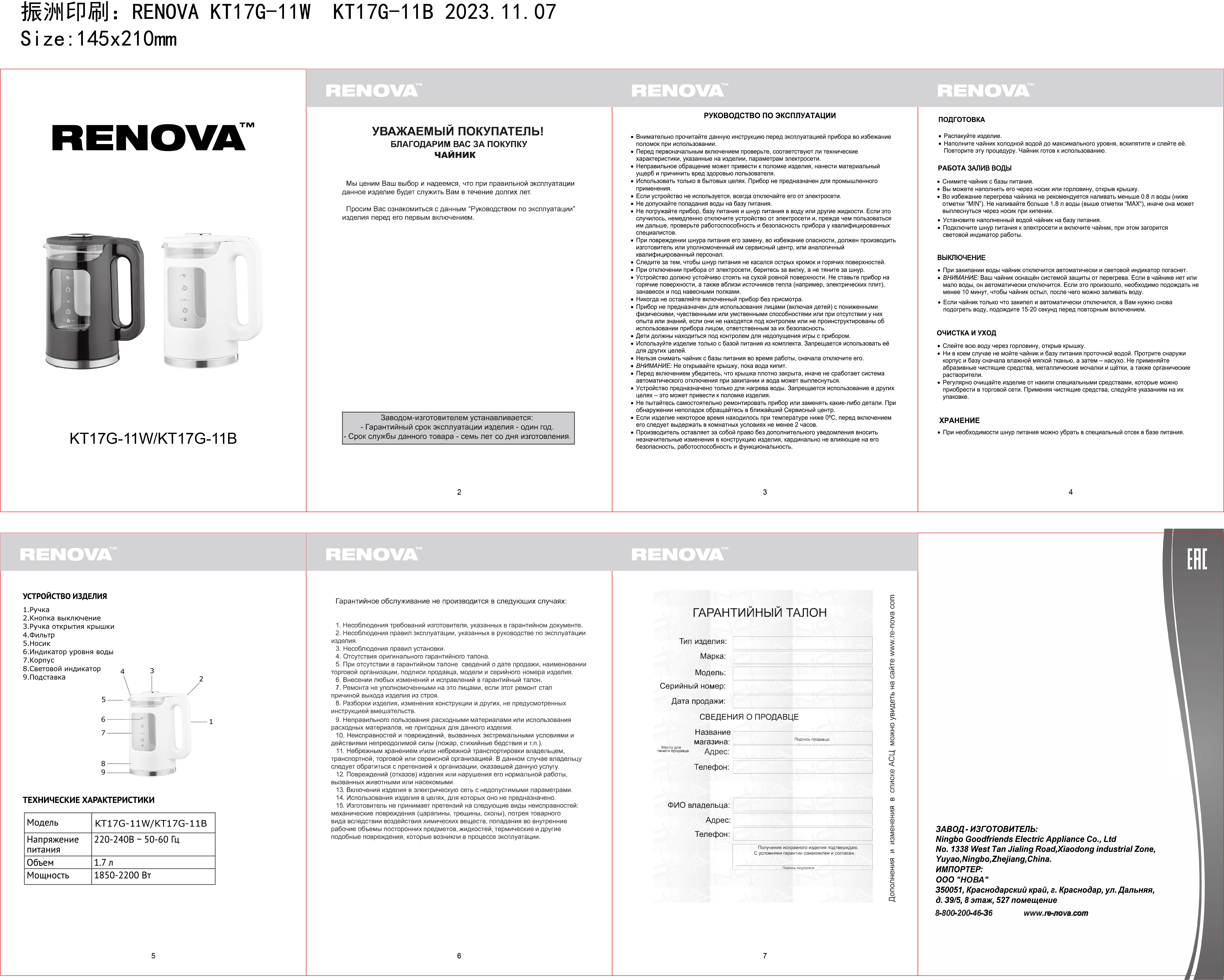 Съемный нейлоновый фильтр в носике электрочайника RENOVA KT17G-11W улавливает частицы накипи, не давая им попасть в чашку с напитком. Откидная крышка с защелкой открывается достаточно широко, чтобы можно было легко промыть чайник изнутри. Для защиты прибора от преждевременной поломки используется механизм блокировки включения без воды. Вращение чайника на подставке на 360° и его автоматическое отключение при закипании обеспечивают комфортную эксплуатацию.