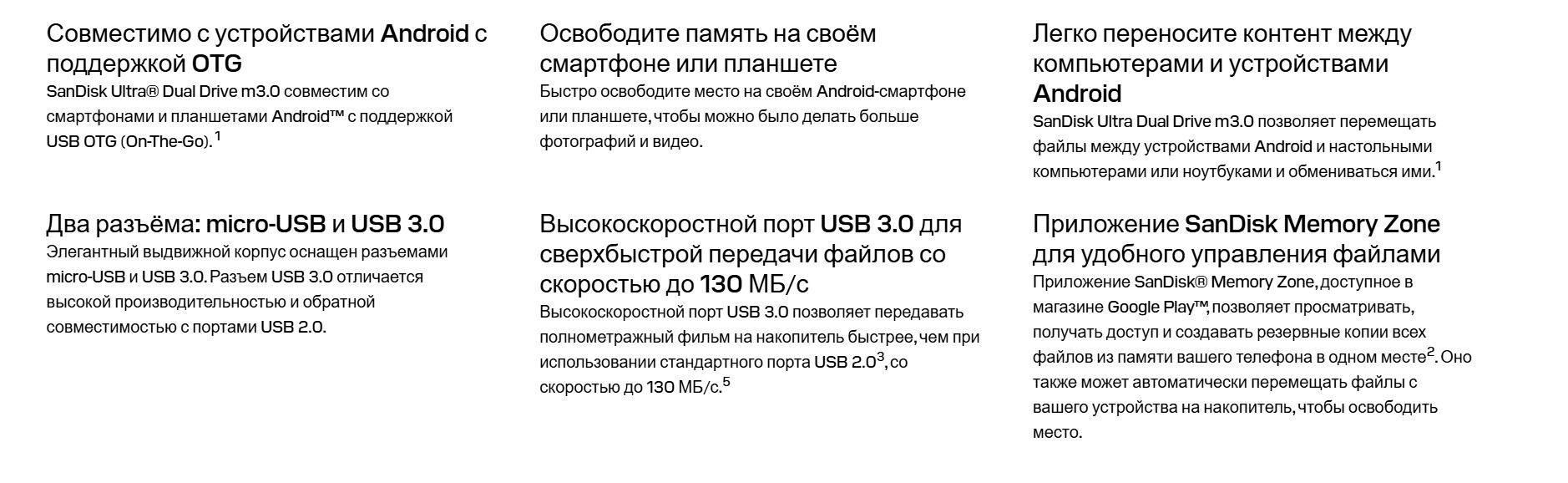 Благодаря разъёму micro-USB на одном конце и разъёму USB 3.0 на другом накопитель позволяет легко перемещать контент между устройствами со смартфона или планшета Android на ноутбук, ПК или компьютер Mac1.