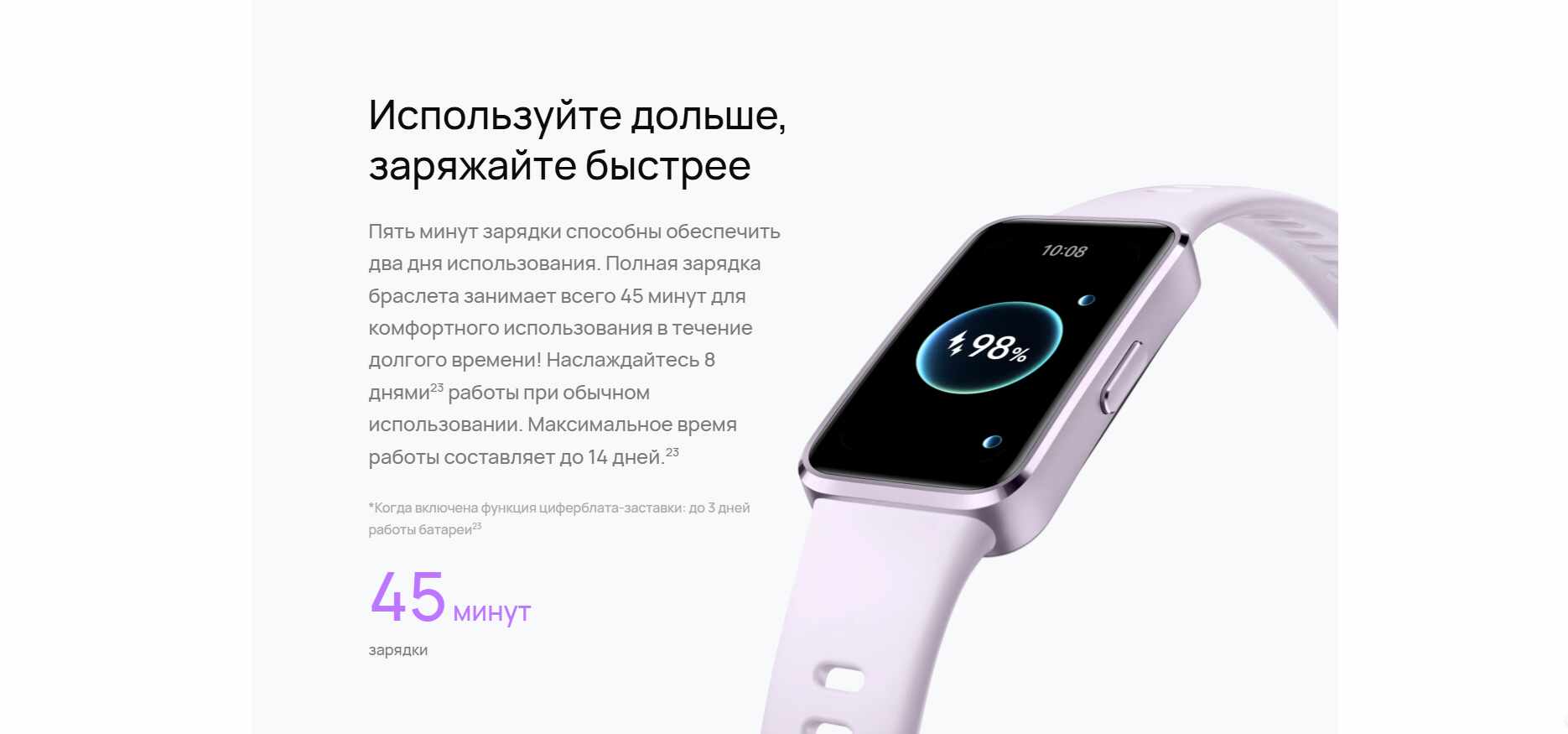 Модель получила сенсорный дисплей AMOLED диагональю 1.47”. Браслет фиксирует на руке с помощью ремешка из фторэластомера.