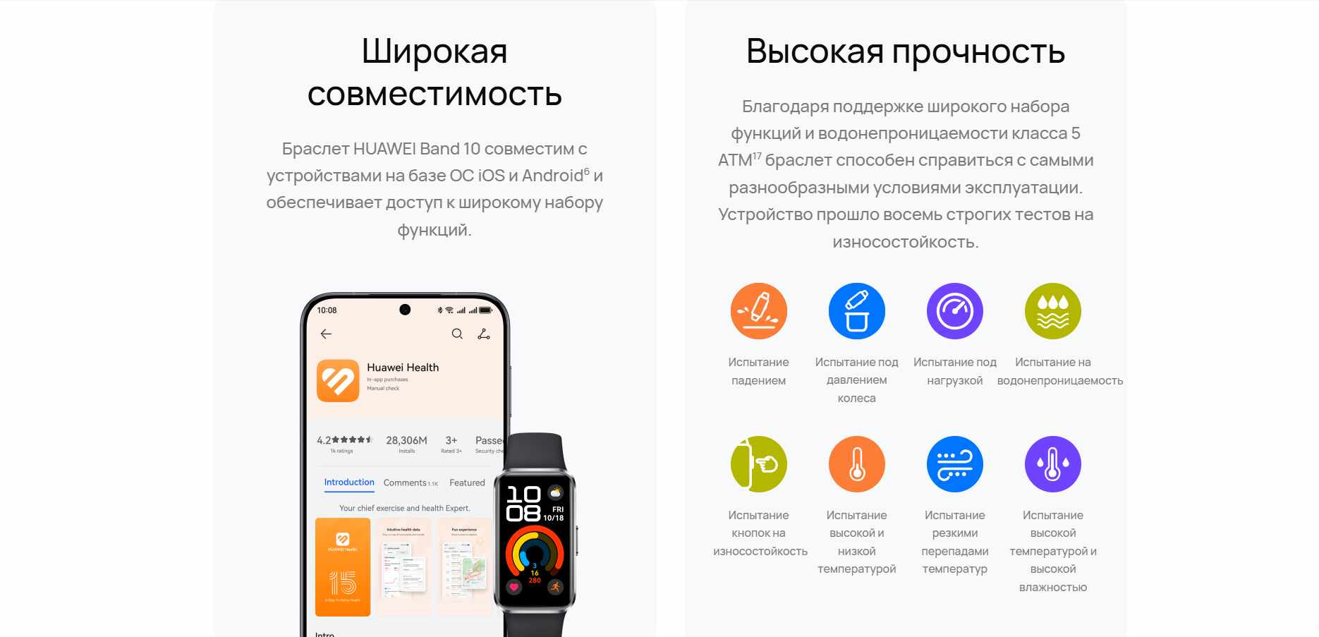 Фитнес-браслет HUAWEI Band 10 совместим со смартфонами на базе Android и iOS. Модель подключается к устройству по Bluetooth 5.0 и сохраняет связь на расстоянии до 10 м.