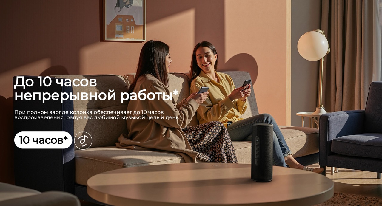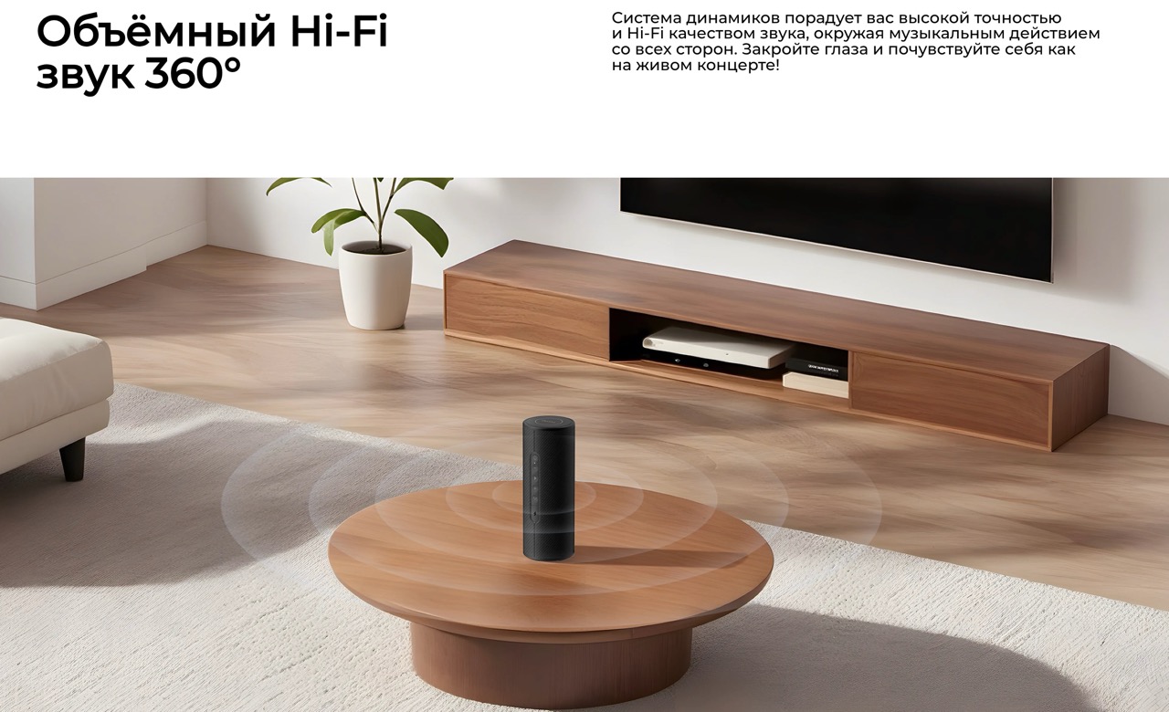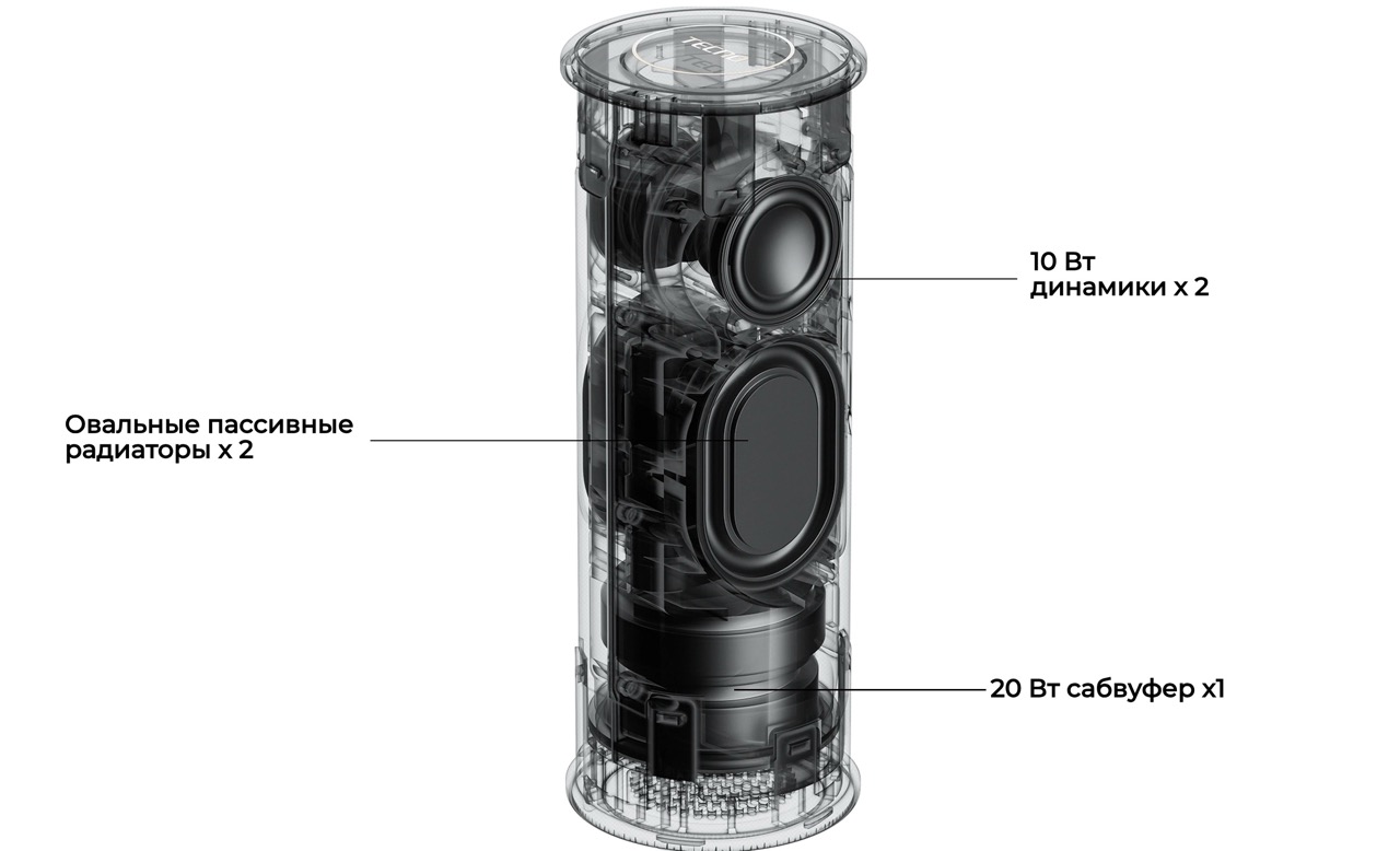 Два высокочастотных динамика по 10 Вт каждый, два пассивных радиатора овальной формы и один басовый вуфер 20 Вт даже на половине громкости колонки впечатлят превосходным звучанием!