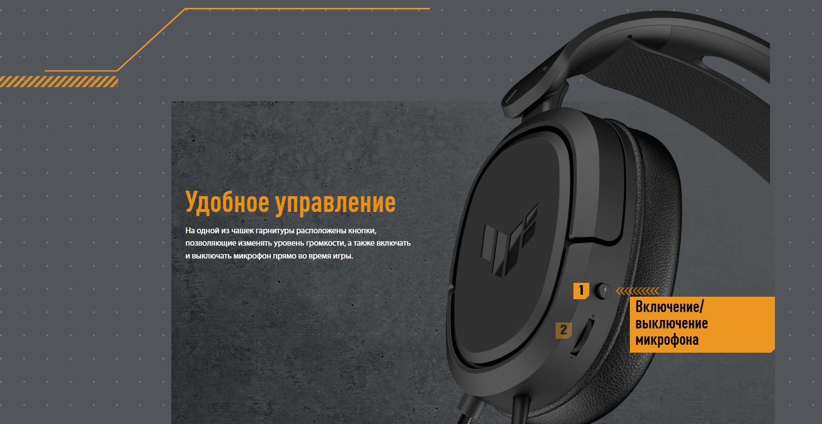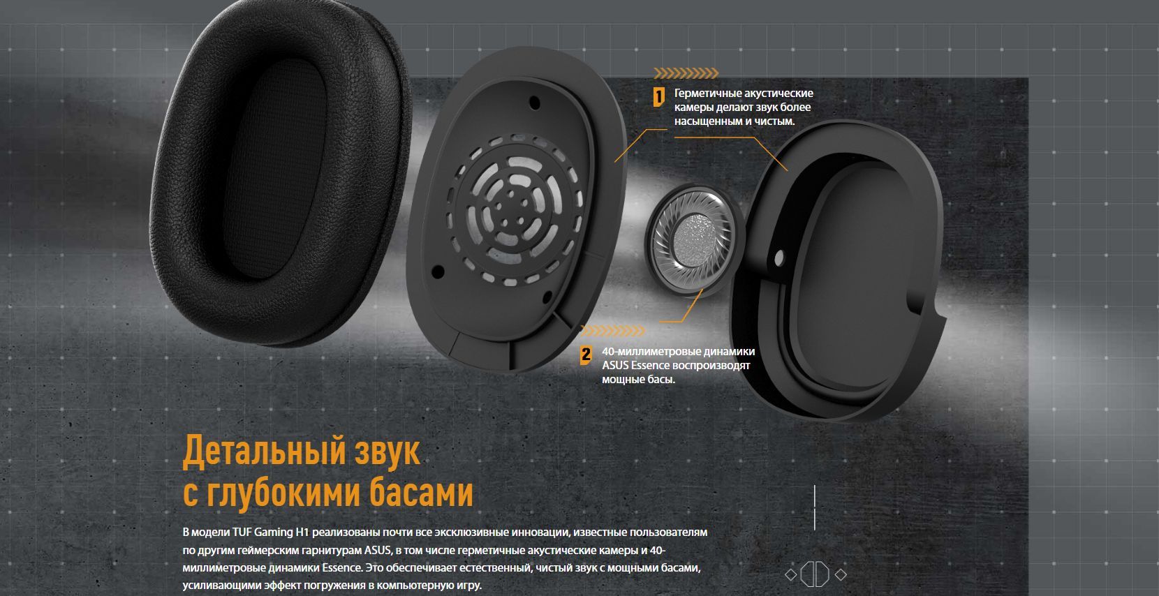 Беспроводные/проводные наушники ASUS TUF Gaming H1 WL оснащены 40-миллиметровыми излучателями и герметичными акустическими камерами, которые обеспечивают иммерсивное звучание с насыщенным басом.