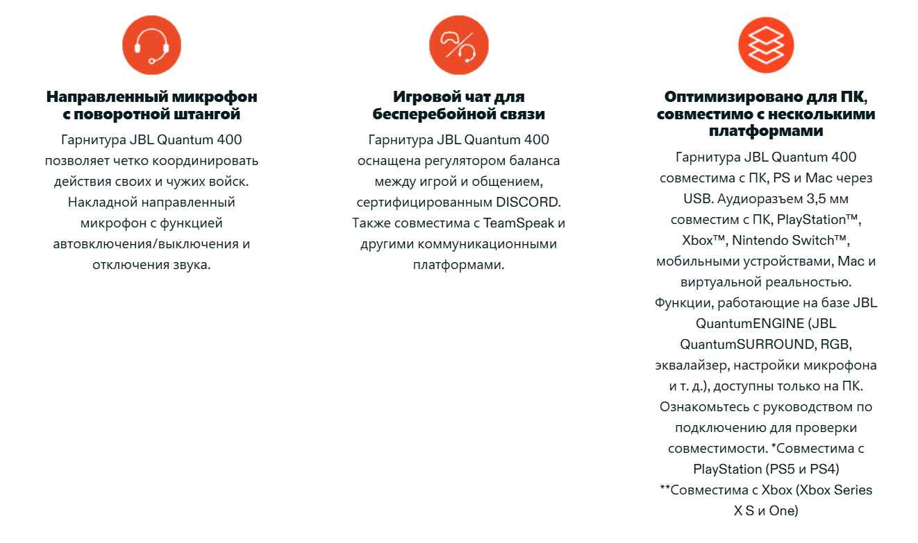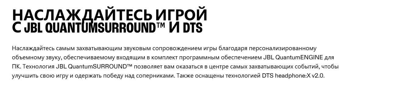 Проводные наушники JBL QUANTUM 400 создают эффектное объемное звучание в частотном диапазоне 20–20000 Гц с мощностью до 30 мВт.