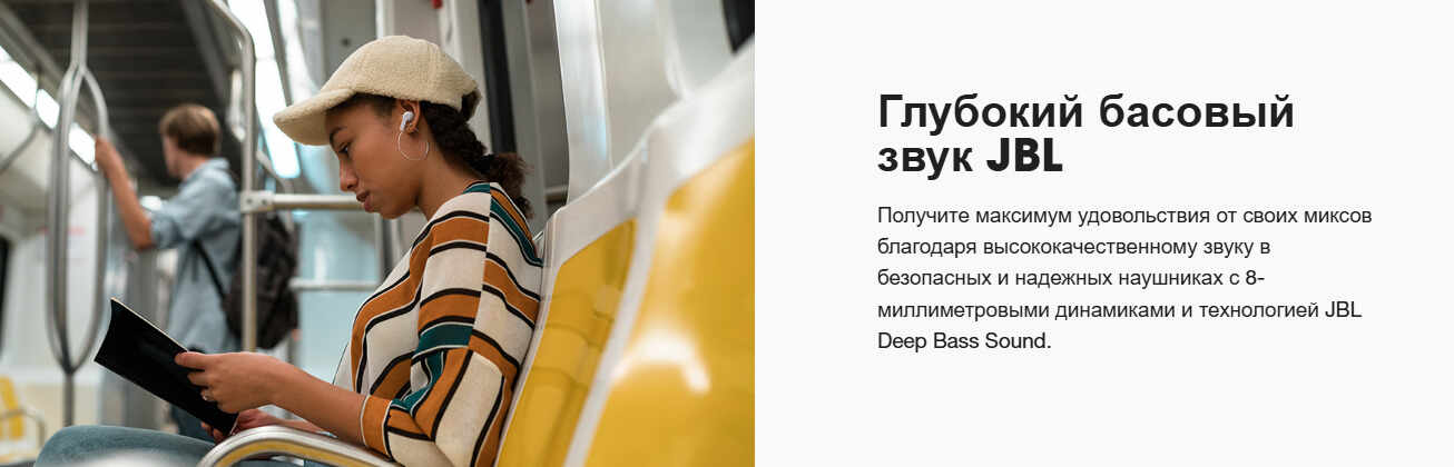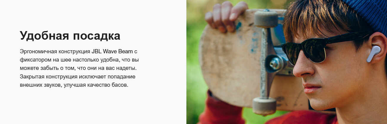 Наушники JBL Wave Beam с защищенной конструкцией от брызг воды и проникновения пыли позволяют комфортно слушать музыку и общаться на тренировках, прогулках, в поездках.