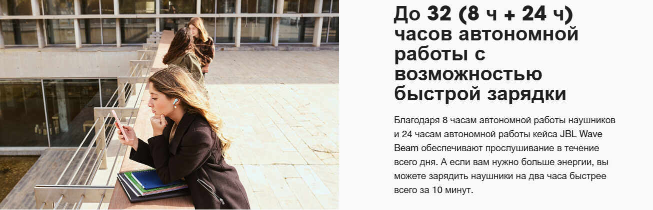 Наушники JBL Wave Beam синхронизируются со смартфоном по беспроводному интерфейсу Bluetooth 5.2.