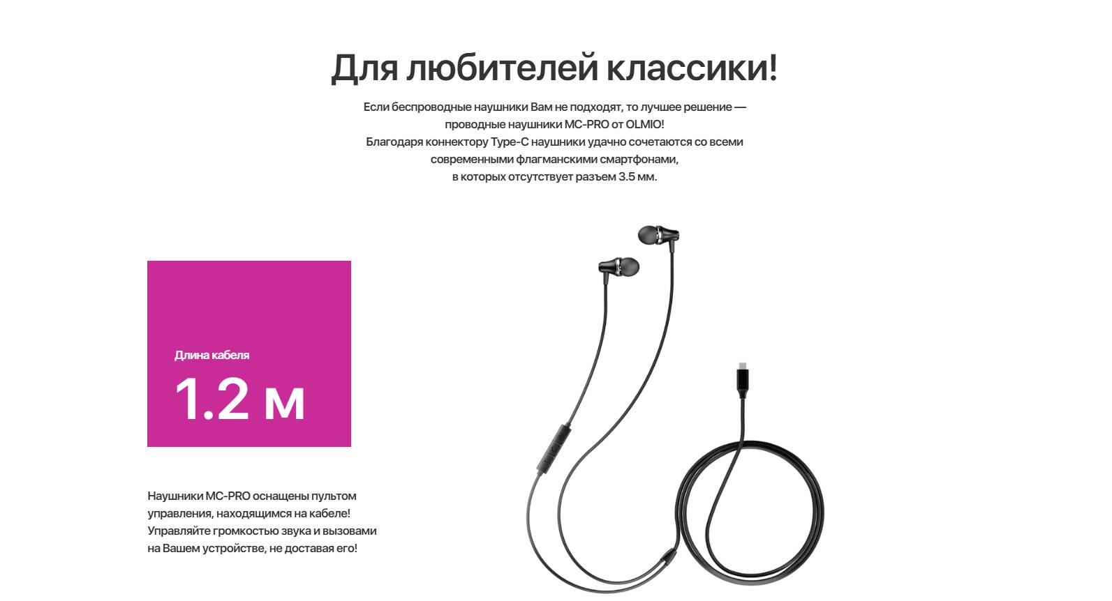 Проводные наушники OLMIO с микрофоном Type-C «MC-Pro» это высококачественный аудиоаксессуар, который обеспечивает отличное качество звука и удобство использования.