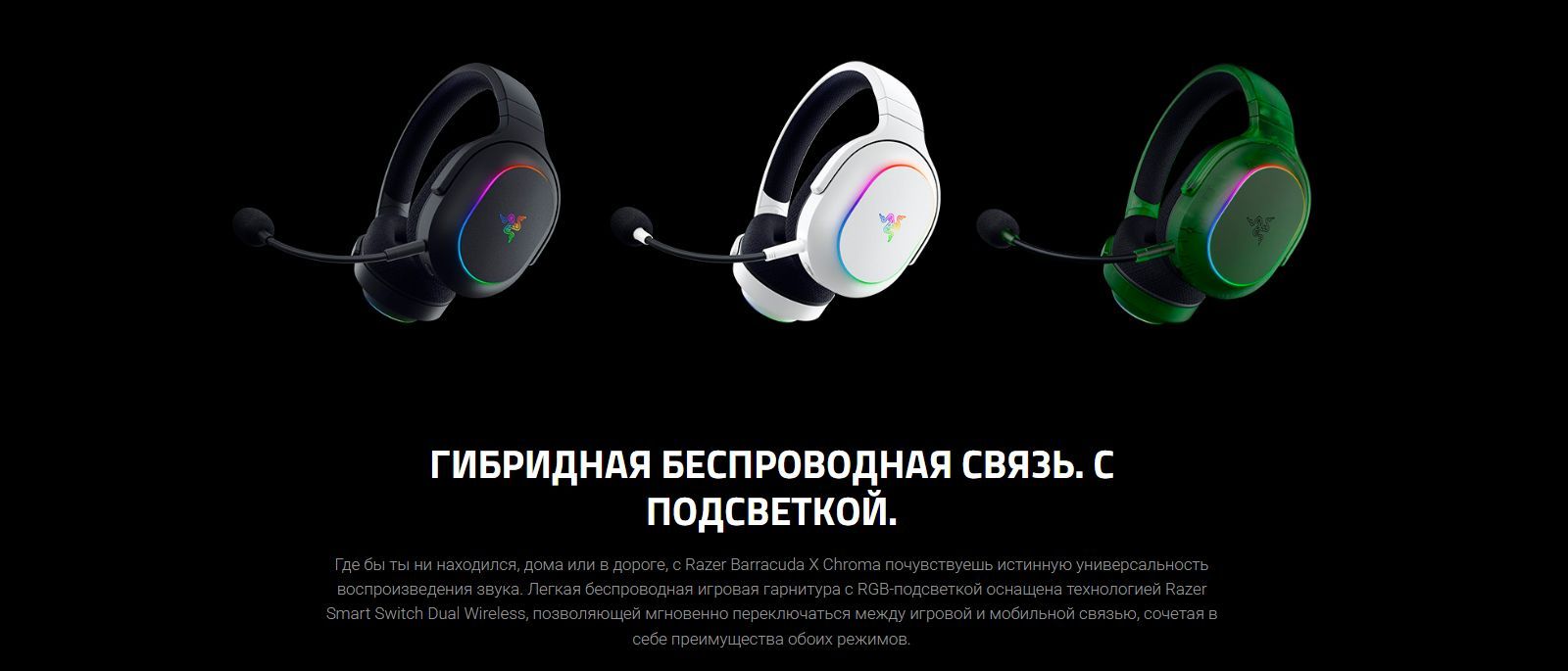 Радиочастотная гарнитура Razer Barracuda X подключается к устройствам через адаптер USB-C, по Bluetooth или с помощью отсоединяемого аналогового кабеля 3.5 мм.