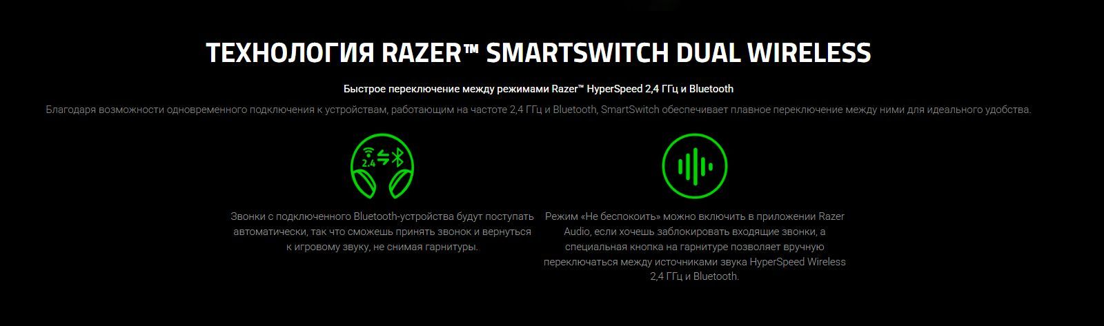 - 2 одновременных подключения по беспроводной связи Razer SmartSwitch Dual Wireless (2,4 ГГц + Bluetooth)
