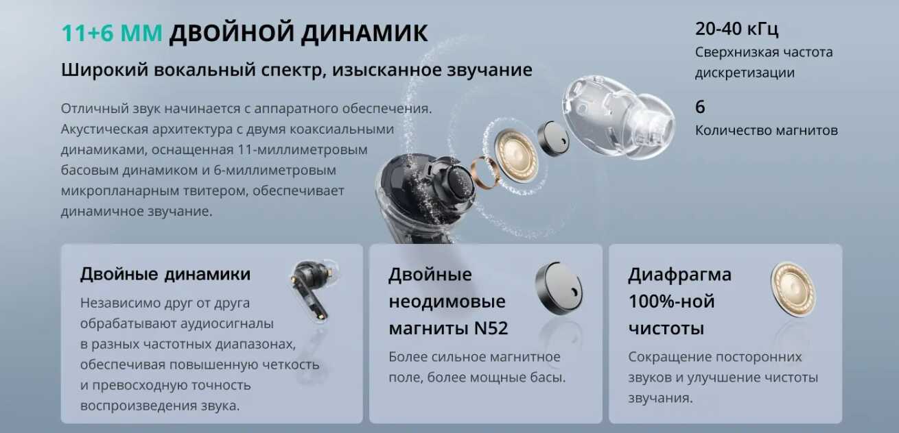 Отличный звук начинается с аппаратного обеспечения. Акустическая архитектура с двумя коаксиальными динамиками, оснащенная 11-миллиметровым басовым динамиком и 6-миллиметровым микропланарным твитером, обеспечивает динамичное звучание.