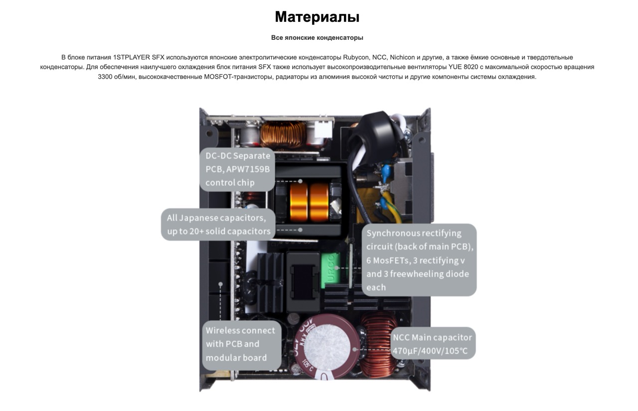 В стандартном объёме SFX (125*63,5*100 мм) блок питания не располагает достаточным пространством для установки компонентов. Для достижения высокой мощности требуются высококачественные компоненты и продуманная схемотехническая структура. 1STPLAYER использует блок питания Platinum с LLC-схемой и мостовым выпрямителем, что позволяет добиться высокой выходной мощности 650/750 Вт от блока питания SFX одним махом.