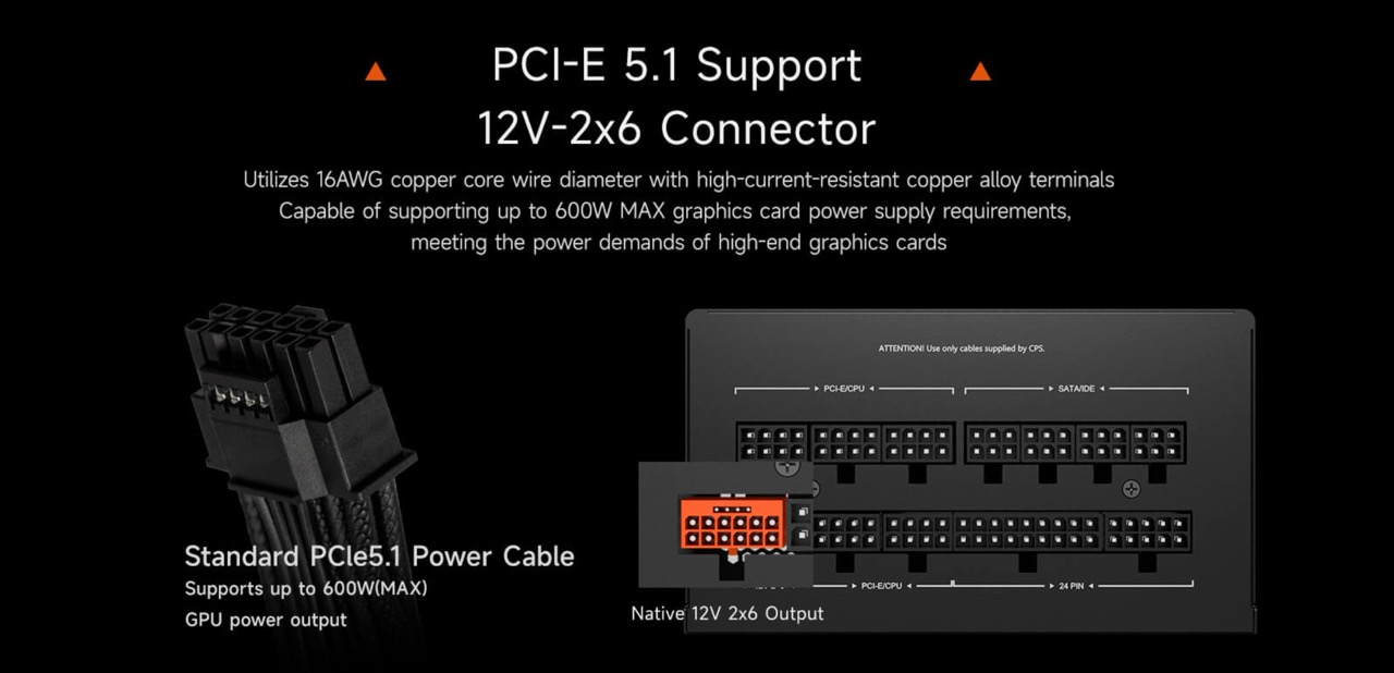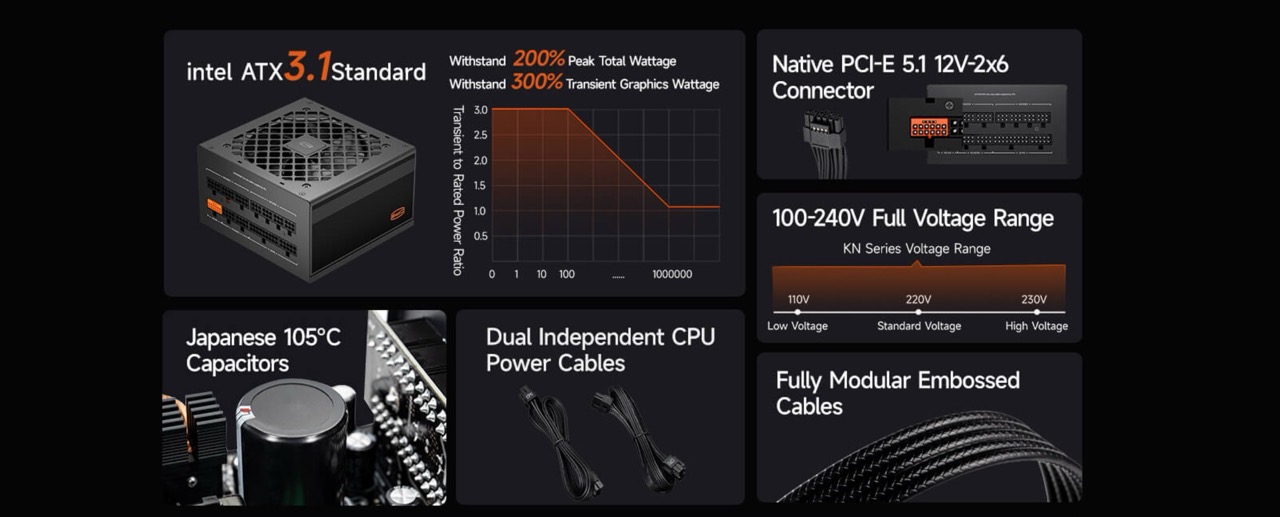 Блок питания PCCooler P3-KN850-G1F мощностью 850 Вт предлагает высокую эффективность и гибкость подключения для современных игровых и продуктивных систем. Сертифицирован по стандарту 80 PLUS Gold, он обладает полностью модульной системой кабелей и улучшенной архитектурой питания с активным PFC. Благодаря поддержке стандарта ATX 3.1 / PCIe 5.1 и наличию множества разъёмов (включая разъёмы питания видеокарт и SATA-устройств) этот блок становится отличным выбором для сборок с мощной видеокартой и требовательными нагрузками. Кабели снабжены оплёткой для аккуратной укладки, блок имеет компактные габариты и защищён от перегрузки и короткого замыкания. Идеален для систем, где важны надёжность, шумовой комфорт и чистая регулировка питания.