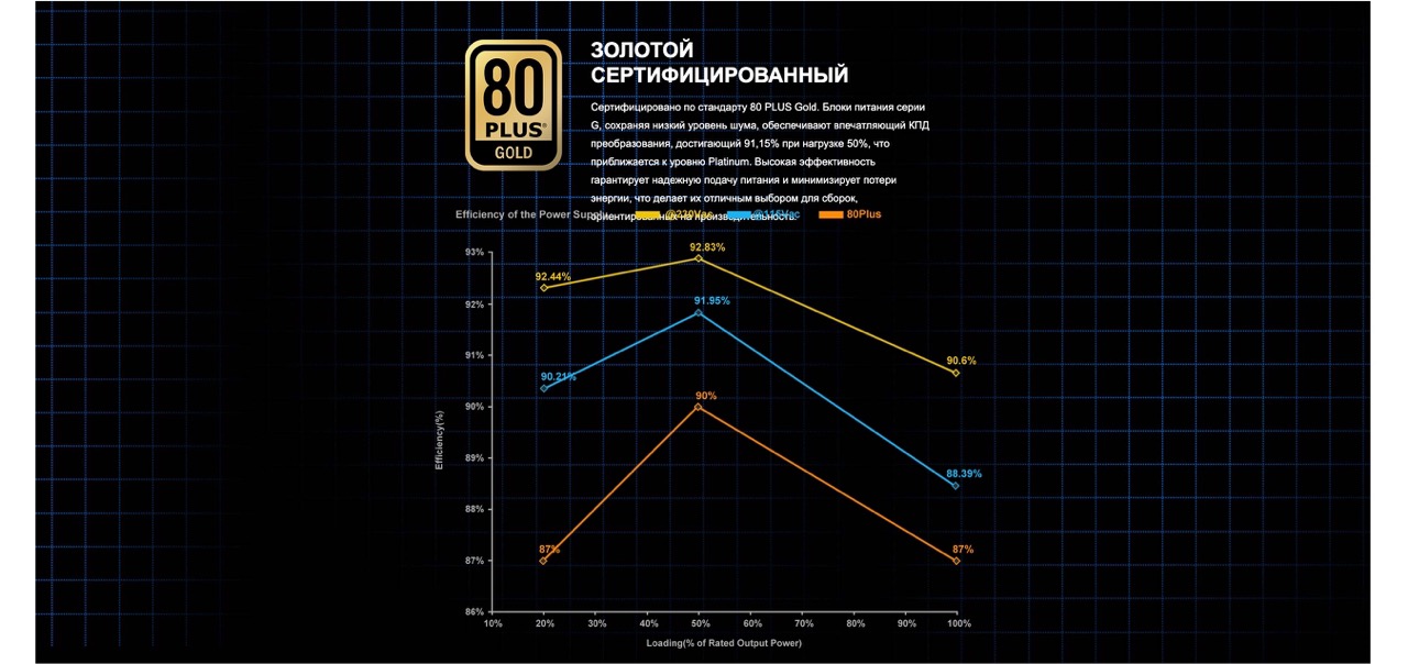 - При сертификации 80 PLUS GOLD, КПД должен быть не менее 87%.