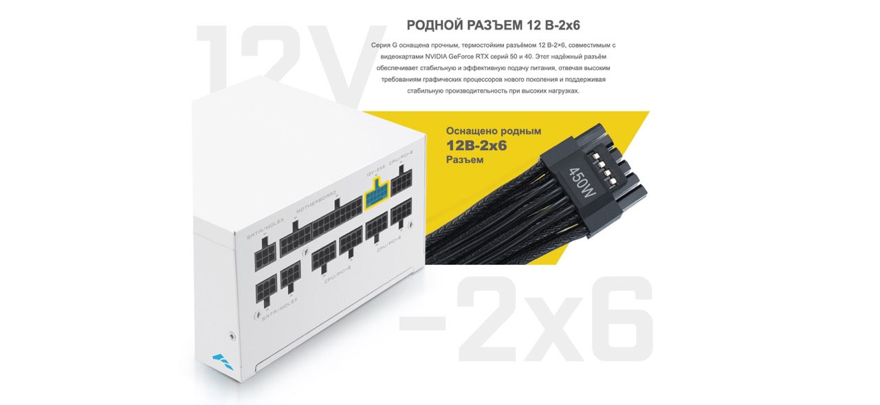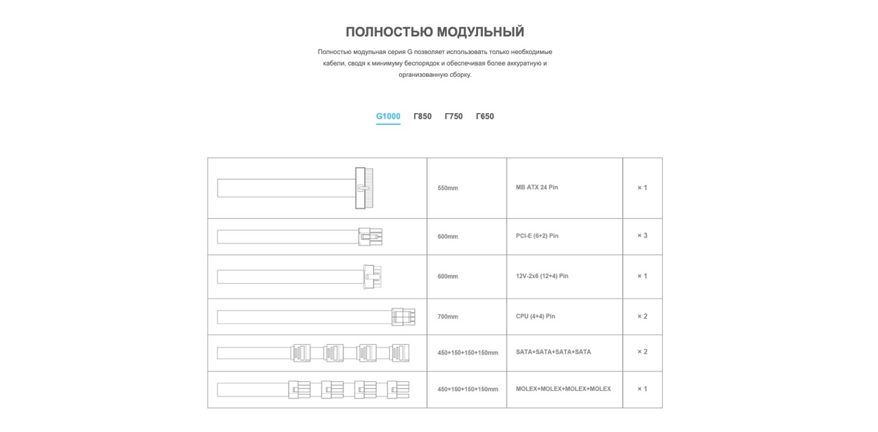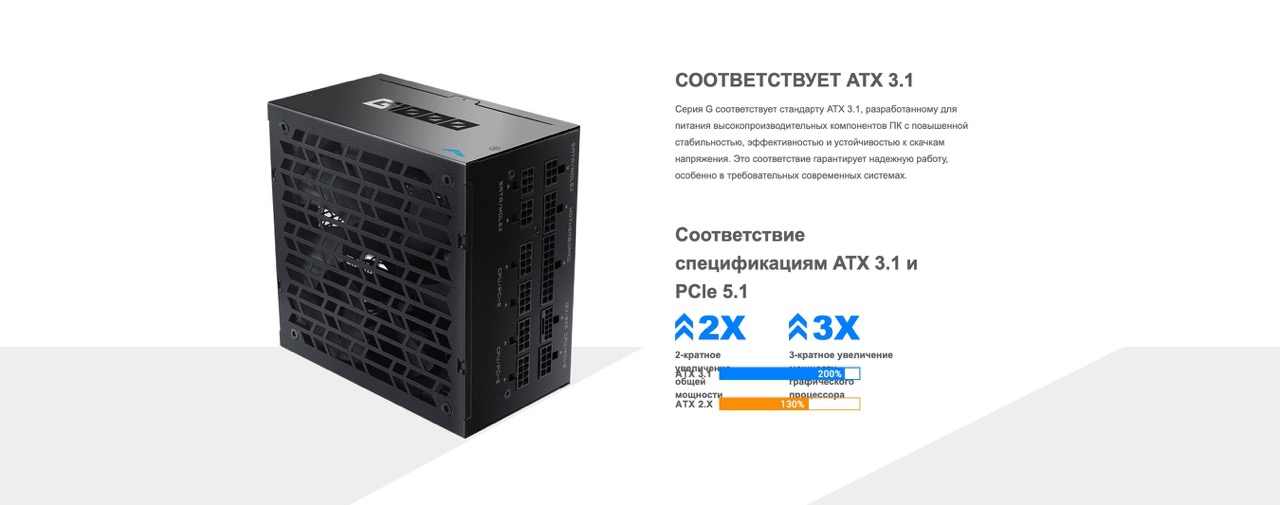 Блок питания серии SAMA G — это полностью модульный блок питания с гибким управлением кабелями для более аккуратной и организованной сборки. Он сертифицирован по стандарту 80 PLUS Gold, что подтверждает высокую энергоэффективность, соответствует стандарту ATX 3.1 для стабильной подачи питания и оснащен встроенным разъемом PCIe 5.1 и кабелем, что обеспечивает полную совместимость с новейшими высокопроизводительными видеокартами и долговременную надежность.