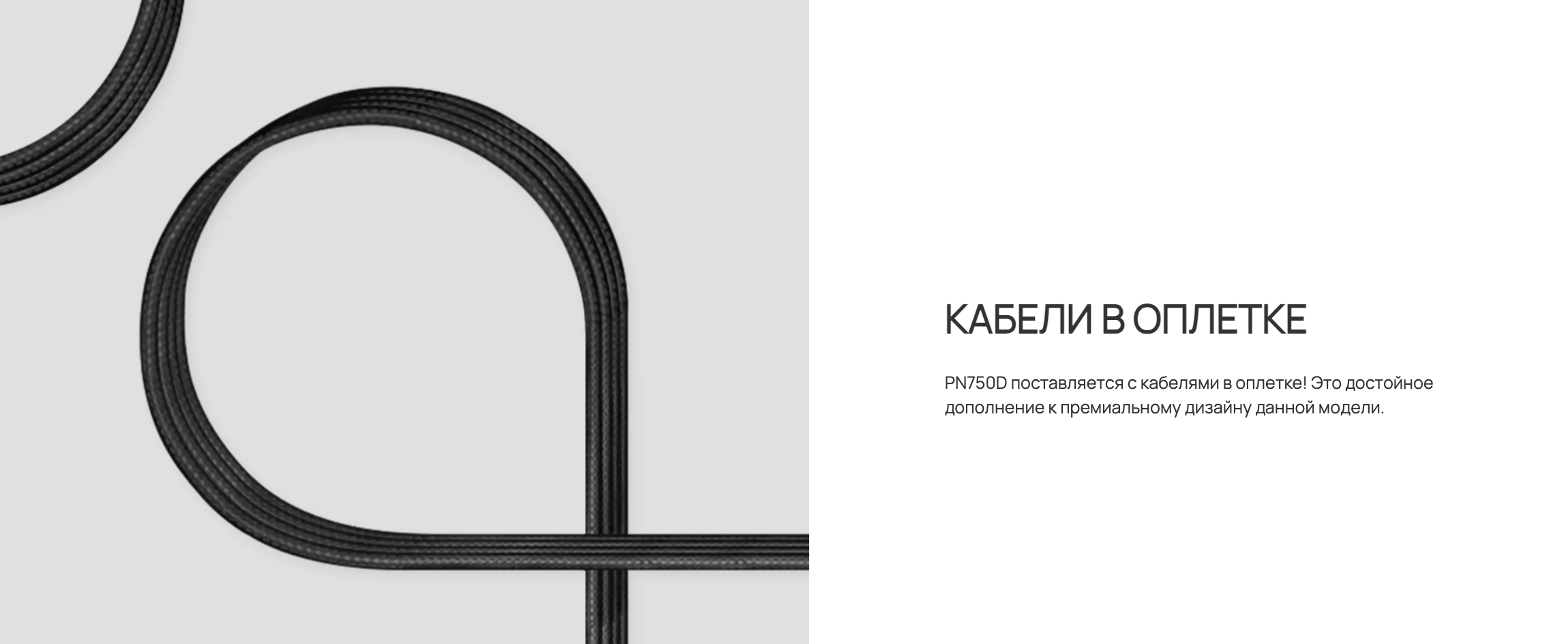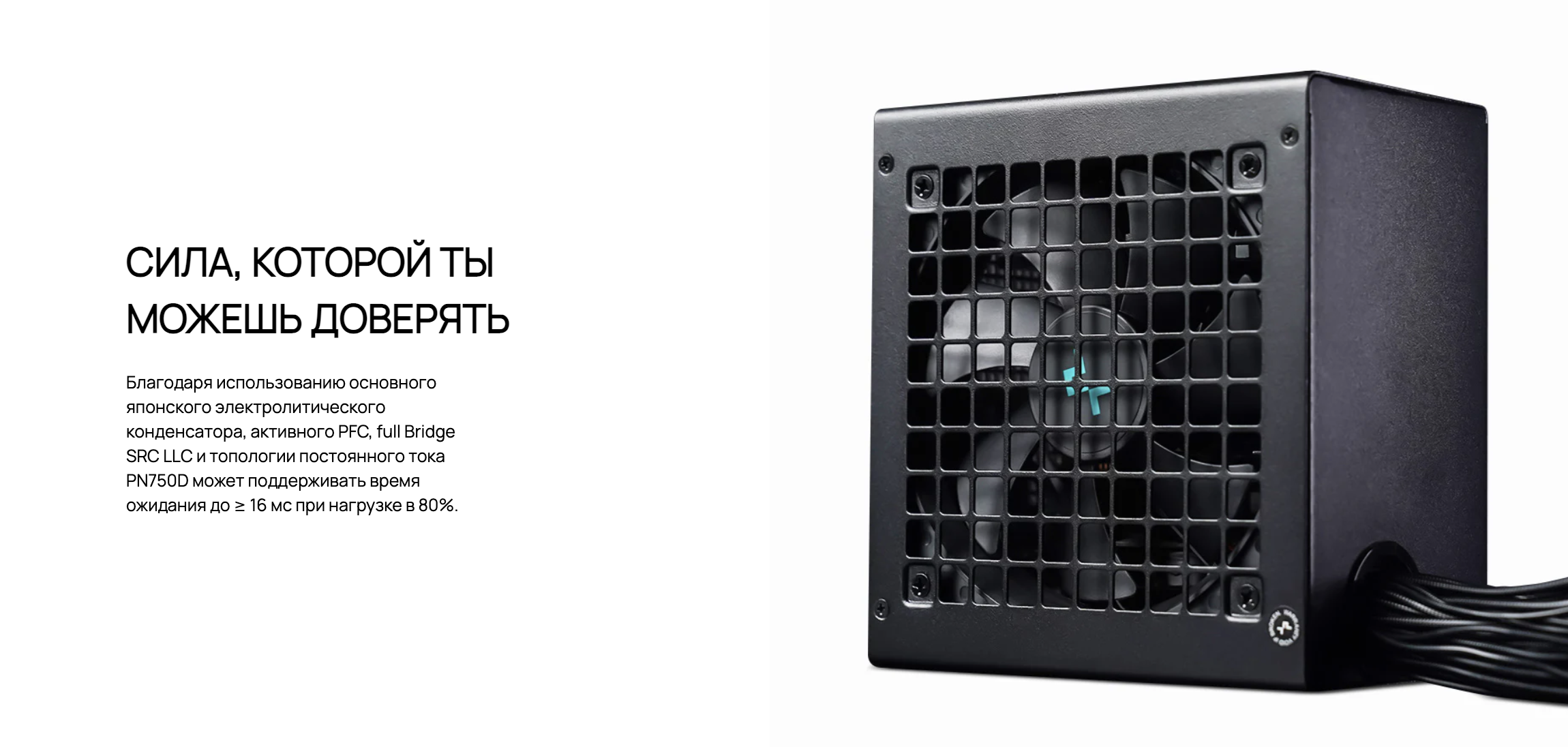 DeepCool PN750D — это новый немодульный блок питания, соответствующий новейшим стандартам Intel ATX 3.1 и PCIe 5.1. Благодаря выделенным разъемам 12 В-2x6, 2 EPS и 3 PCIe, PN750D обеспечивает стабильное питание для широкого спектра современных высокомощных компонентов.