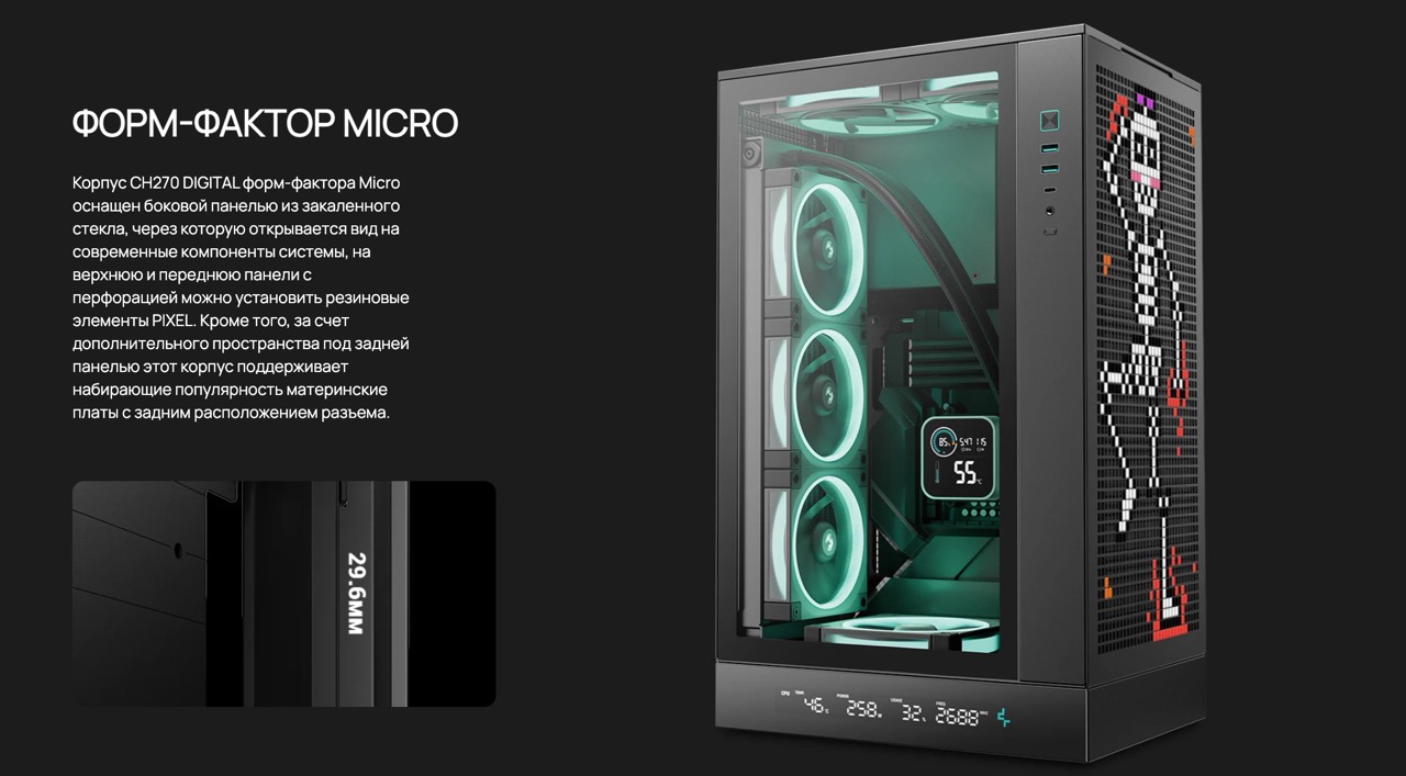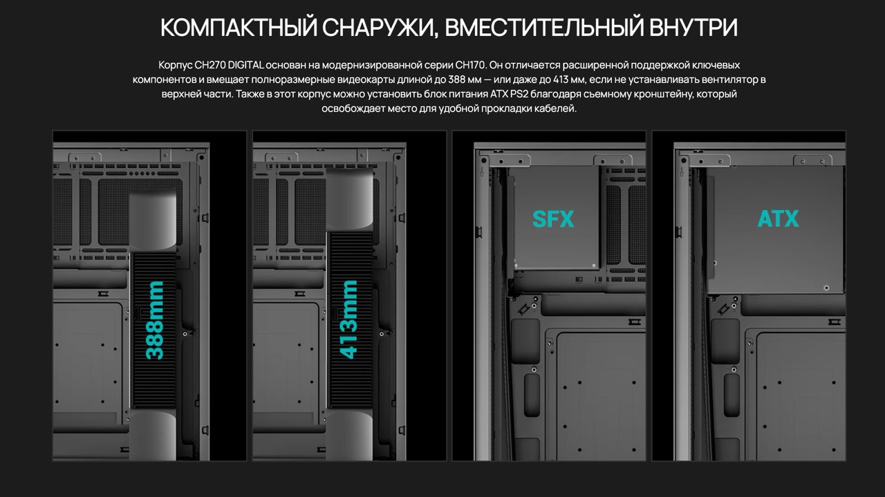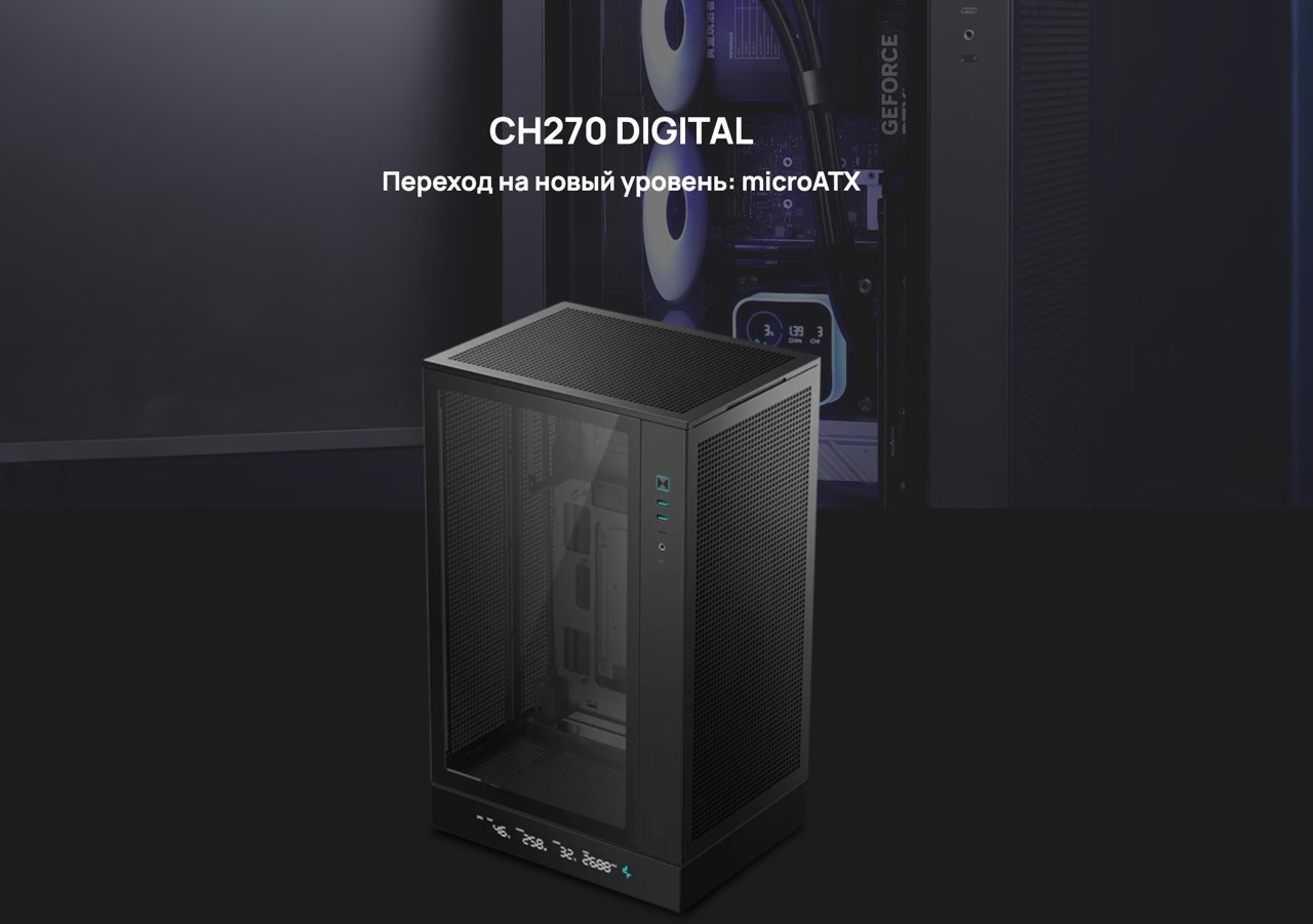 CH270 DIGITAL — это компактный и стильный корпус Mini-Tower, который займет минимум места на рабочем столе. Он вмещает материнские платы вплоть до M-ATX и распространенные компоненты ATX, что заметно упрощает сборку.