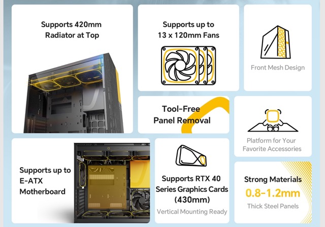 Наличие прозрачной боковой стенки в корпусе. Наличие прозрачного окна позволяет разместить внутри корпуса лампы неоновой подсветки, что придает ему индивидуальность. Также к особенностям можно отнести RGB подсветку, съемную корзину для жестких дисков или кард-ридер.