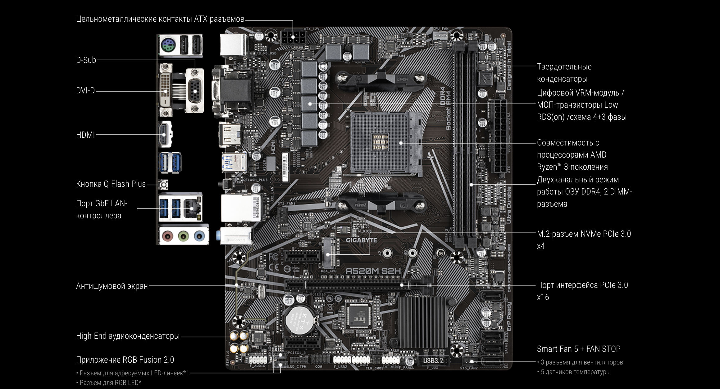 Характеристики Материнская плата Gigabyte A520M S2H DDR4 Socket AM4 AMD A520 mATX