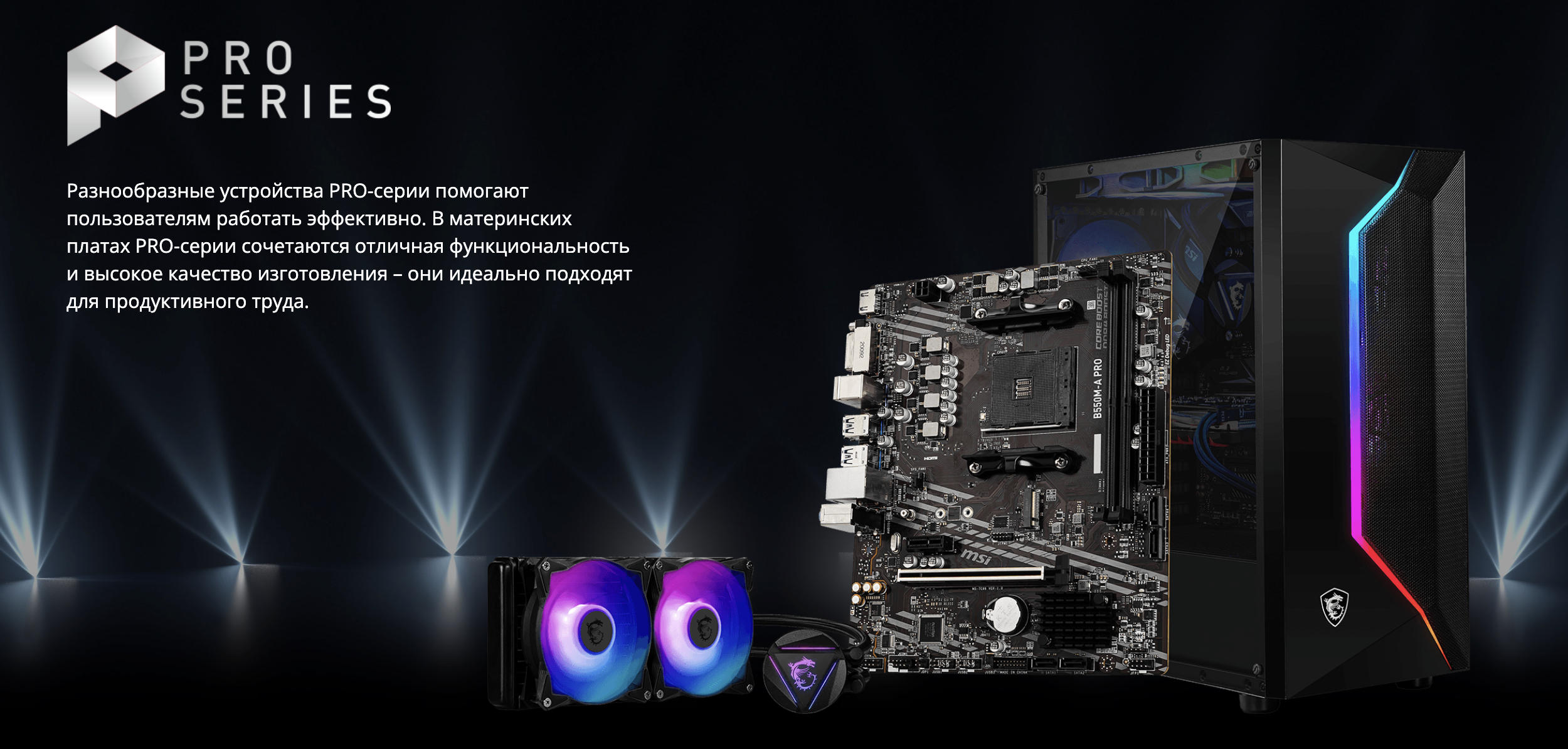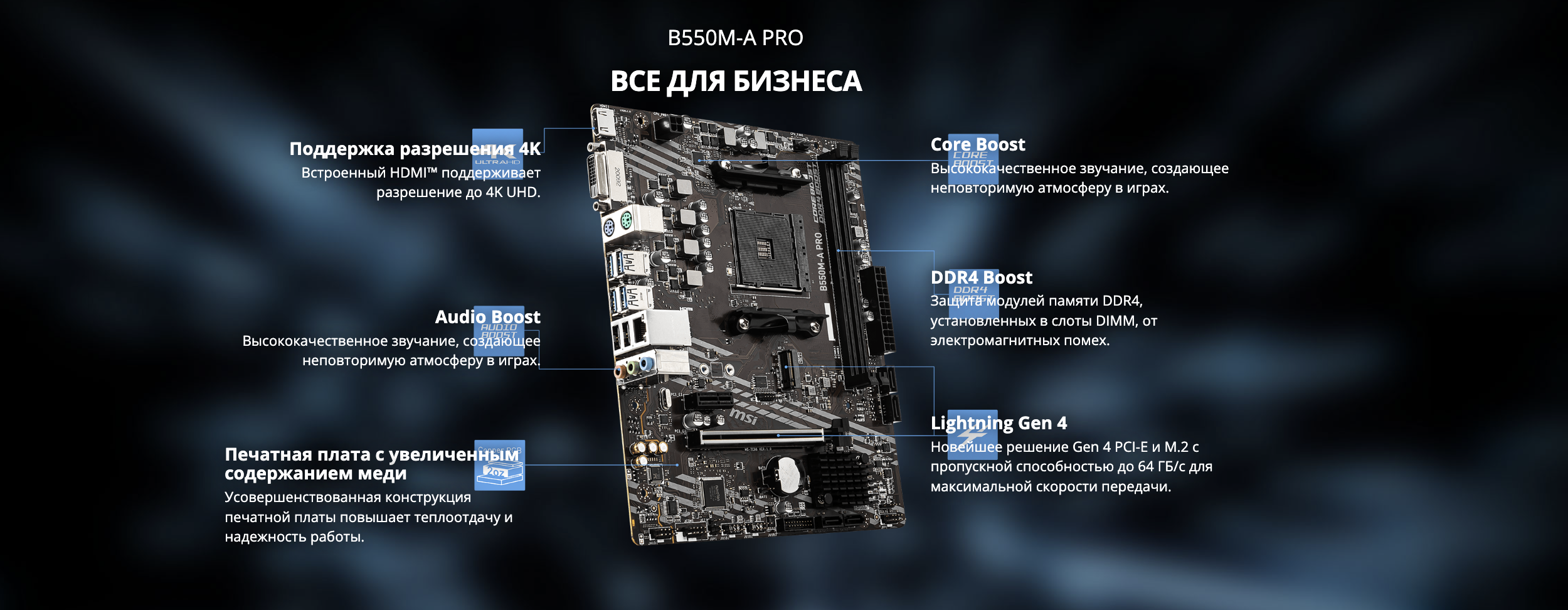 Материнская плата MSI B550M-A PRO получила гнездо SocketAM4 для установки процессора. О совместимости этого оборудования нужно уточнять на сайте производителя. Изделие работает с памятью типа DIMM на частотах 1866 МГц – 4600+ МГц.