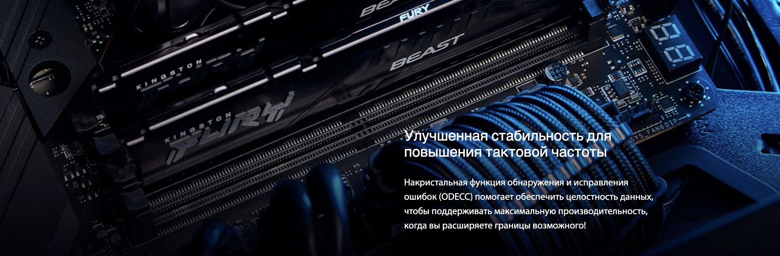 Оперативная память Kingston FURY™ Beast DDR5 обеспечивает превосходную скорость, емкость и надежность для игровых платформ нового поколения. Такие функции, как ECC на кристалле для лучшей стабильности и два 32-разрядных подканала для большей эффективности, помогут повысить производительность компьютера. Kingston FURY Beast DDR5 поддерживает спецификации оверклокинга Intel® XMP 3.0 и AMD EXPO™ с профилями, в которых можно настроить скорости и тайминги, обеспечивающие максимум впечатлений от игр, стримов 4K+, анимации и 3D-рендеринга.