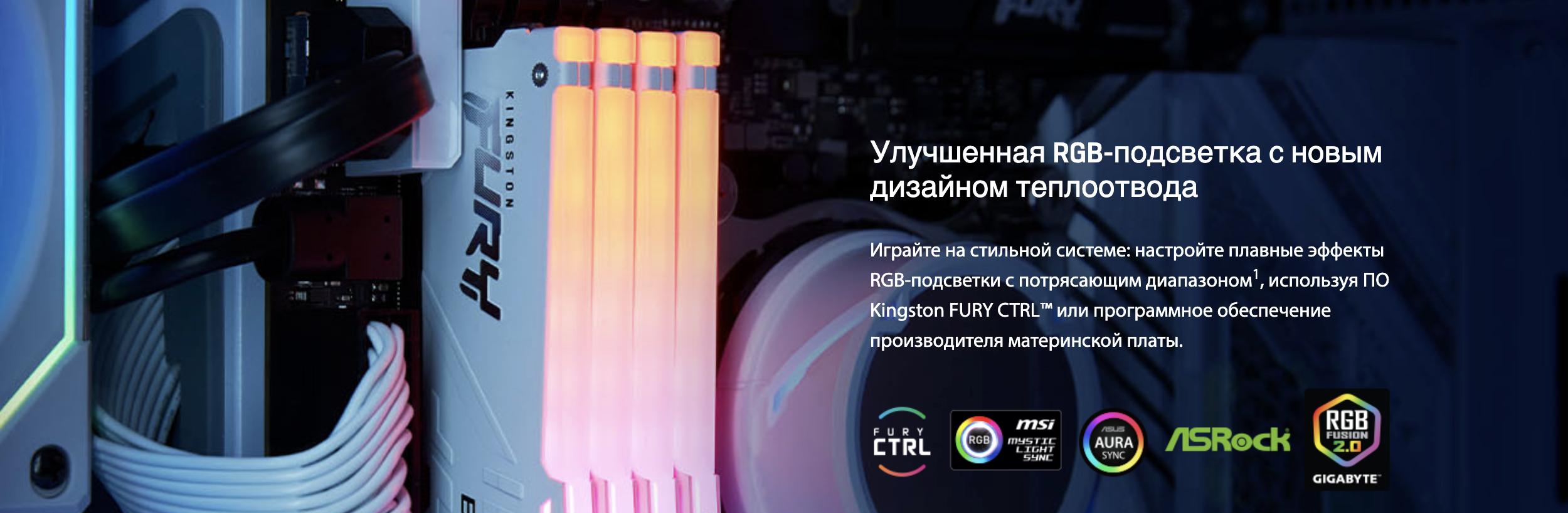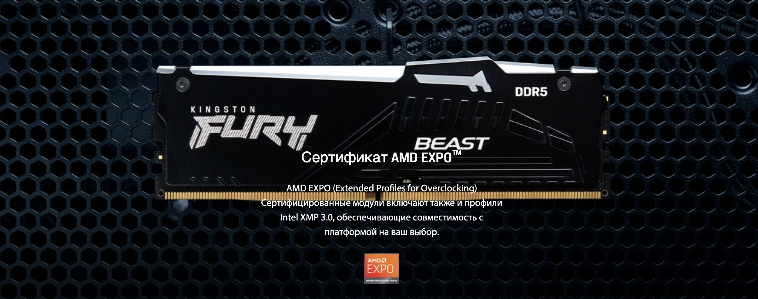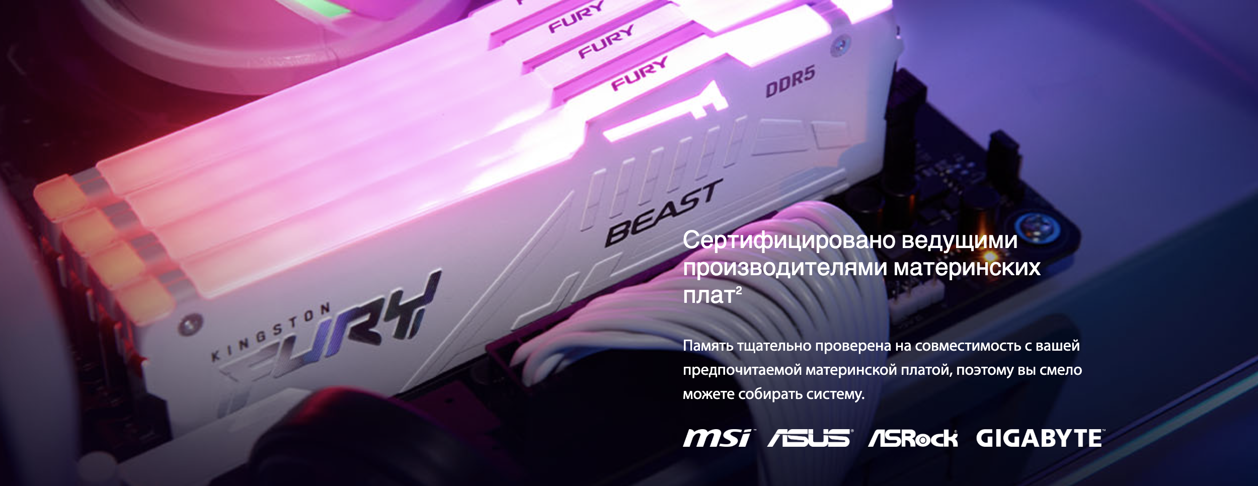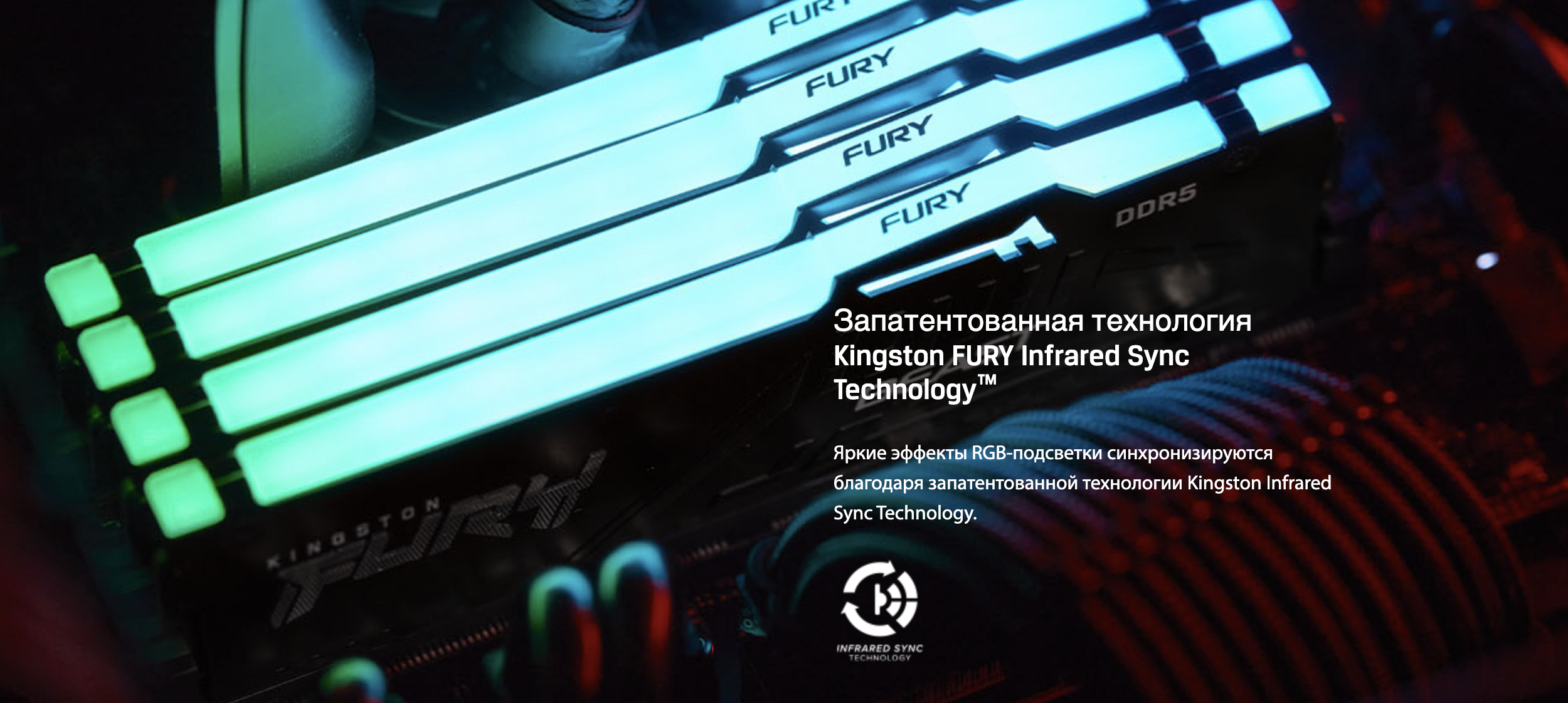 Оперативная память Kingston FURY™ Beast DDR5 RGB достигает скорости до 6800 МТ/с. С технологией Infrared Sync Technology™, обеспечивающей безупречную синхронизацию динамических эффектов подсветки, эта память предлагается с элегантными теплораспределителями черного или белого цвета, поддерживает Intel® XMP 3.0 и AMD EXPO™, полностью протестирована на скорости и обеспечена ограниченной пожизненной гарантией.