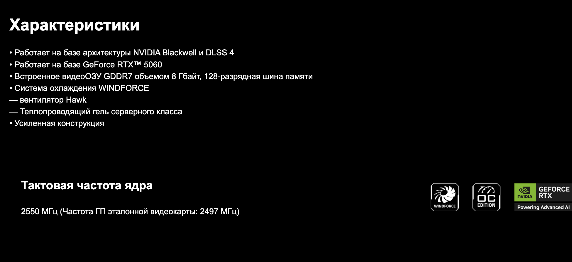 БрендGigabyte Частота графического процессора2497 МГц Объем видеопамяти8 GB Тип видеопамятиGDDR7
