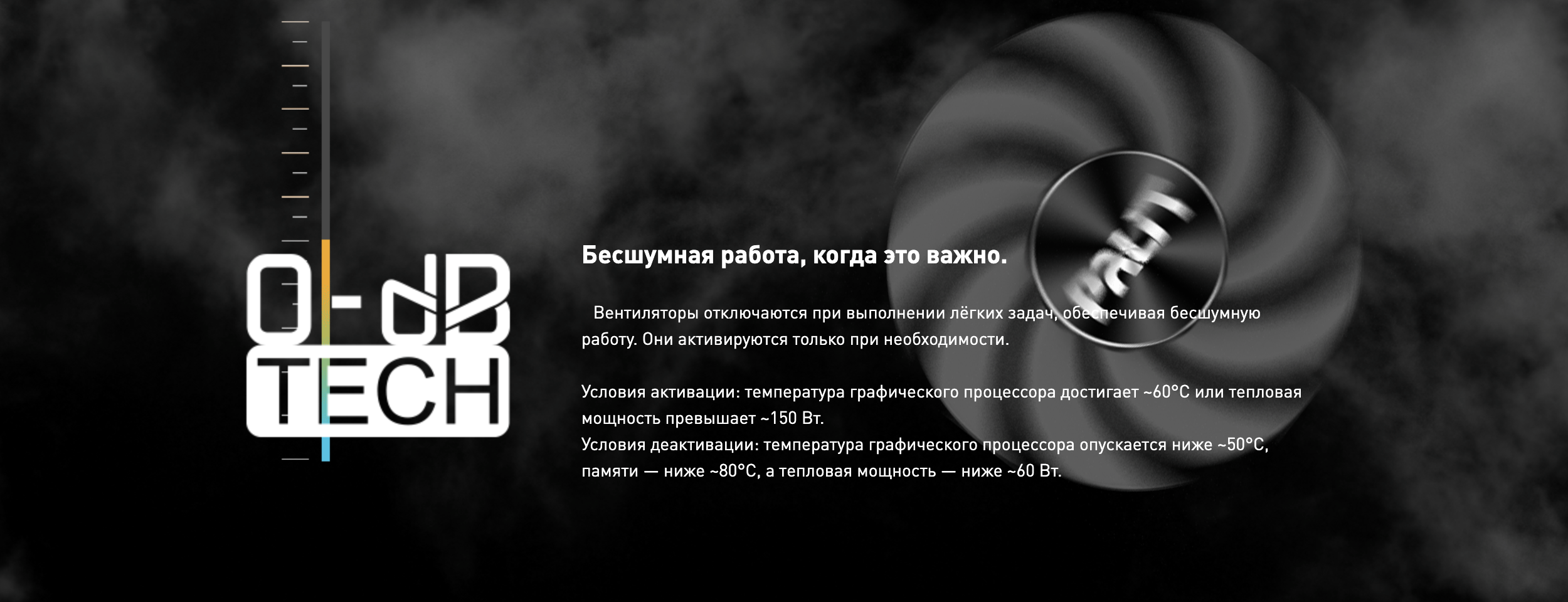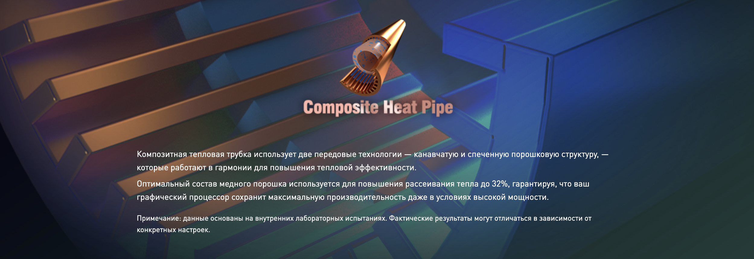 Оснащенная надежной системой охлаждения с тремя вентиляторами, эта модель разработана для игр уровня AAA и ресурсоемких творческих задач. Композитные тепловые трубки, имеющие как рифленую, так и спеченную порошковую структуру, повышают теплопроводность и эффективность, поддерживая максимальную производительность графического процессора.