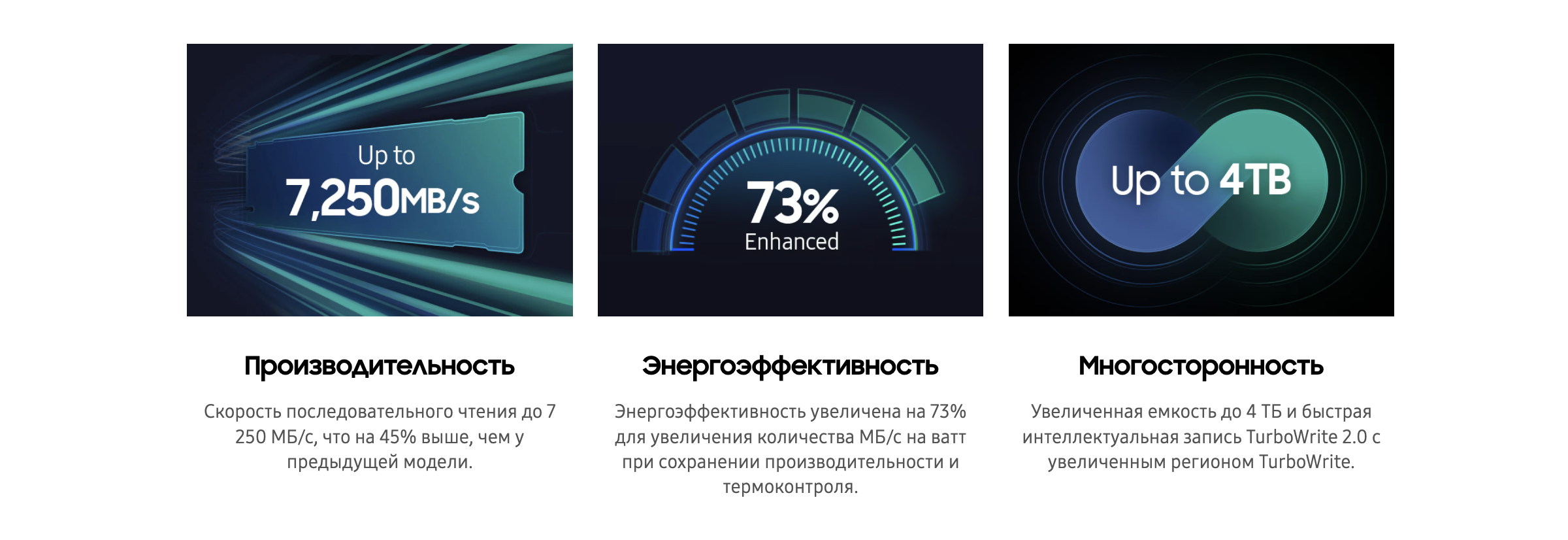 БрендSamsung Тип жесткого дискаSSD Объем накопителя2048 Гб Скорость чтения SSD7250 МБ/с Скорость записи SSD6300 МБ/с