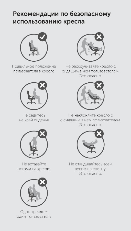 Кресло рассчитано на вес сидящего до 150 кг. Ширина сиденья 545 мм. Минимальная высота кресла 1255 мм.