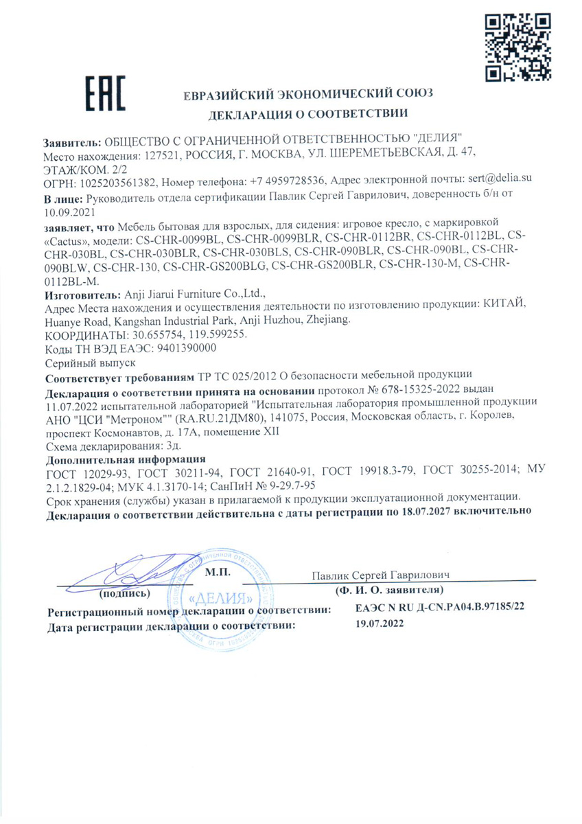 Основные характеристики кресла Cactus CS-CHR-130: