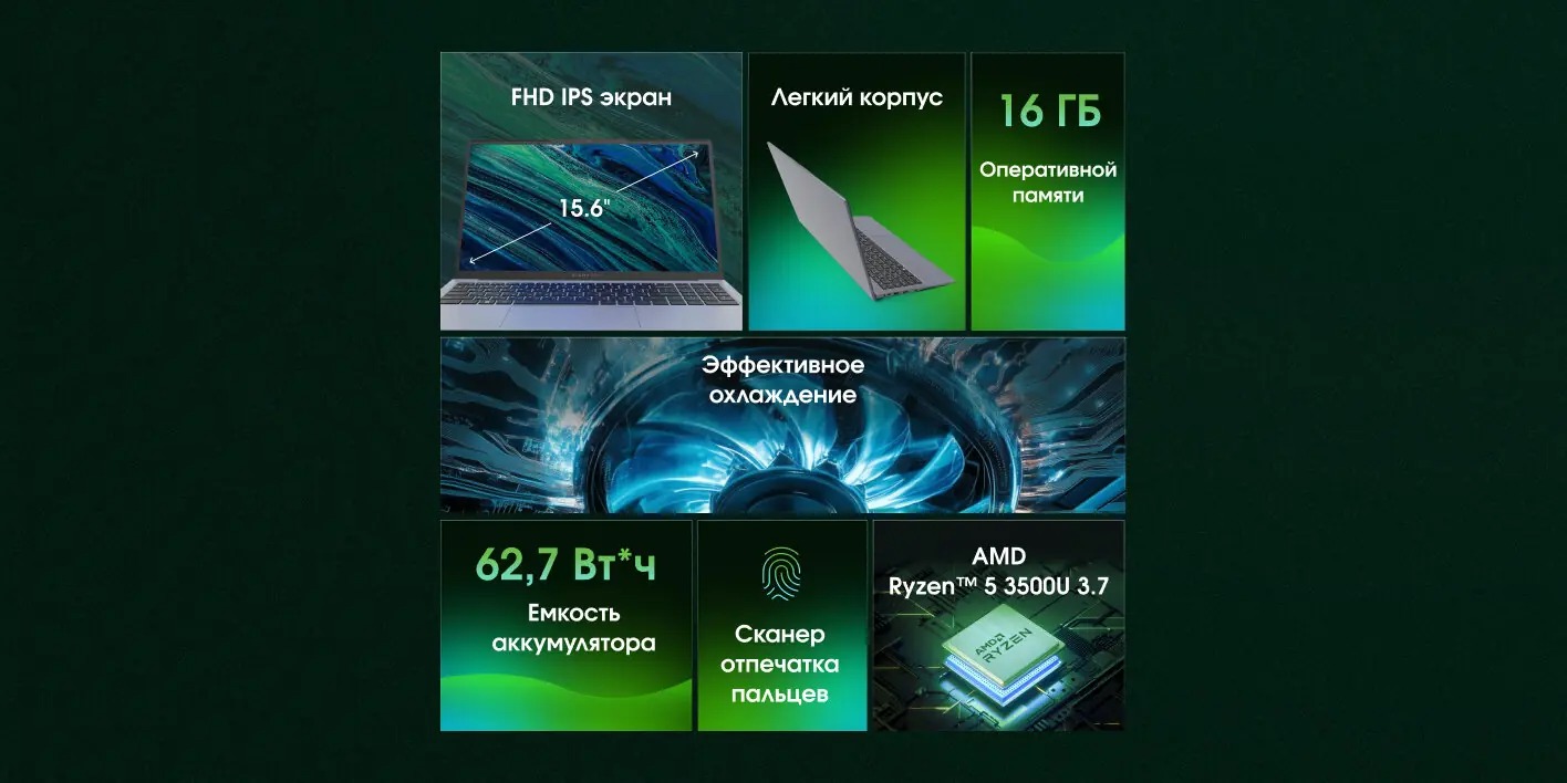 БрендDigma Диагональ экрана15.6 " Тип матрицы ноутбукаIPS Разрешение экрана1920 x 1080 Модель процессораRyzen 5 3500U Модель видеокартыRadeon Vega 8 Объем оперативной памяти16 Гб