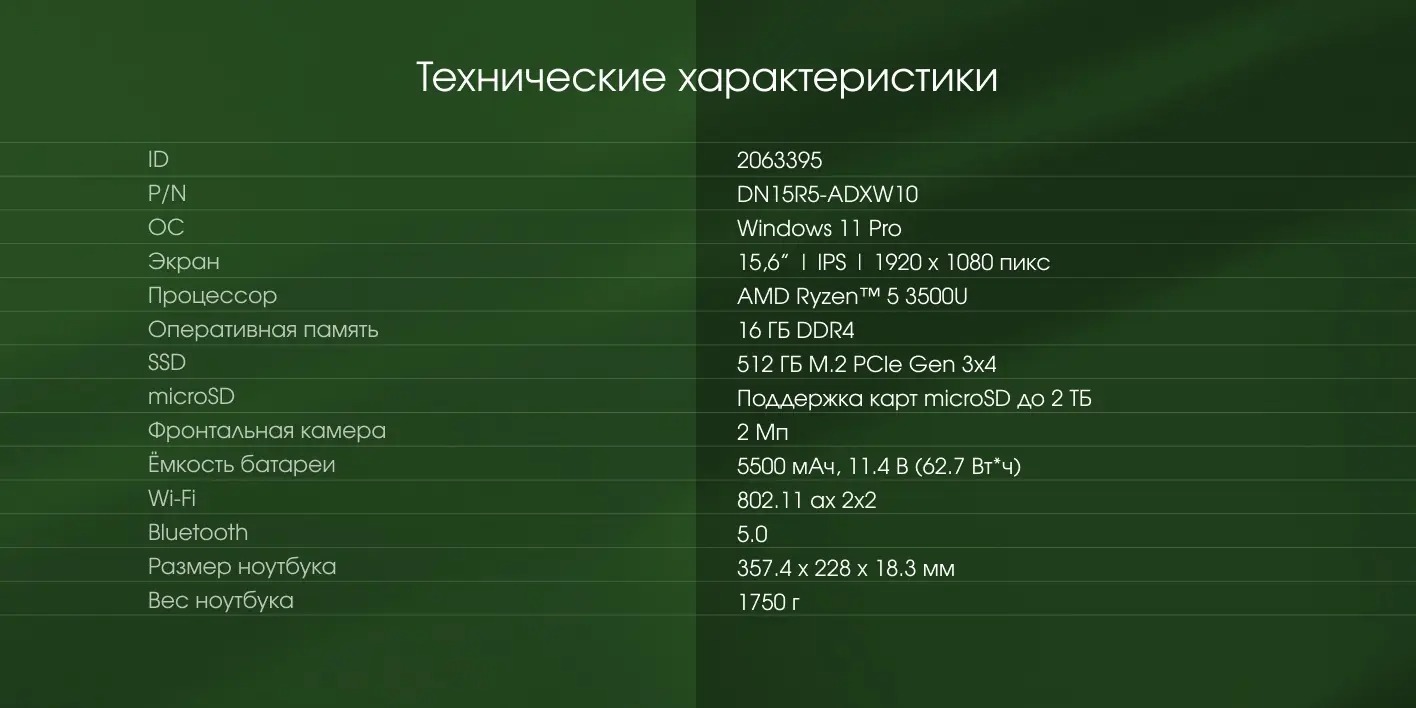 Характеристики Ноутбук Digma Pro Cursus 15.6" AMD Ryzen 5 3500U 16Gb SSD512Gb Windows 11 Pro (DN15R5-ADXW10)
