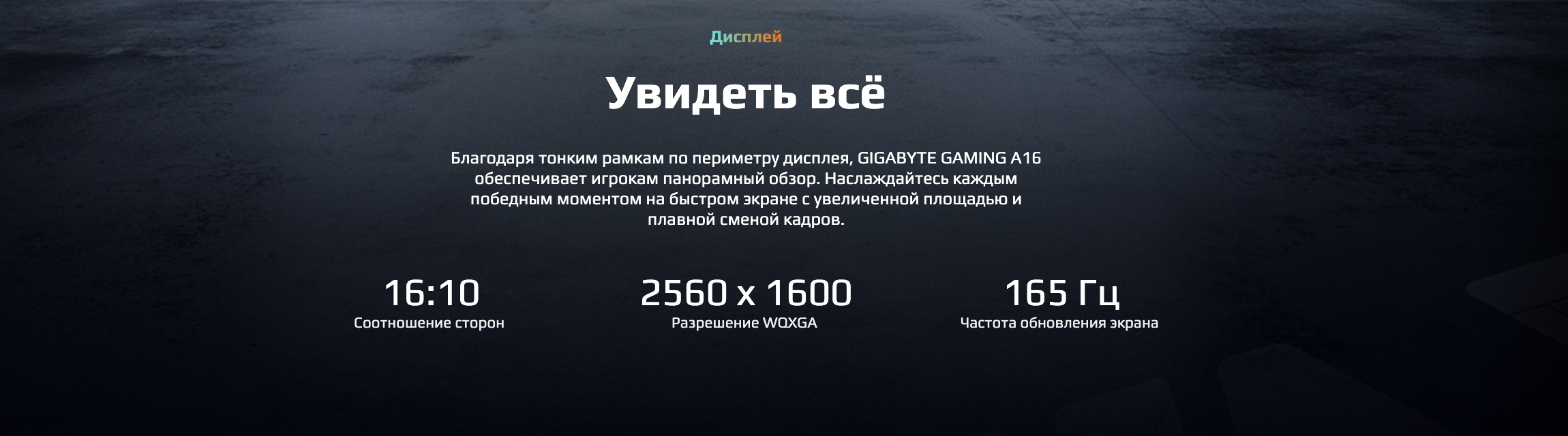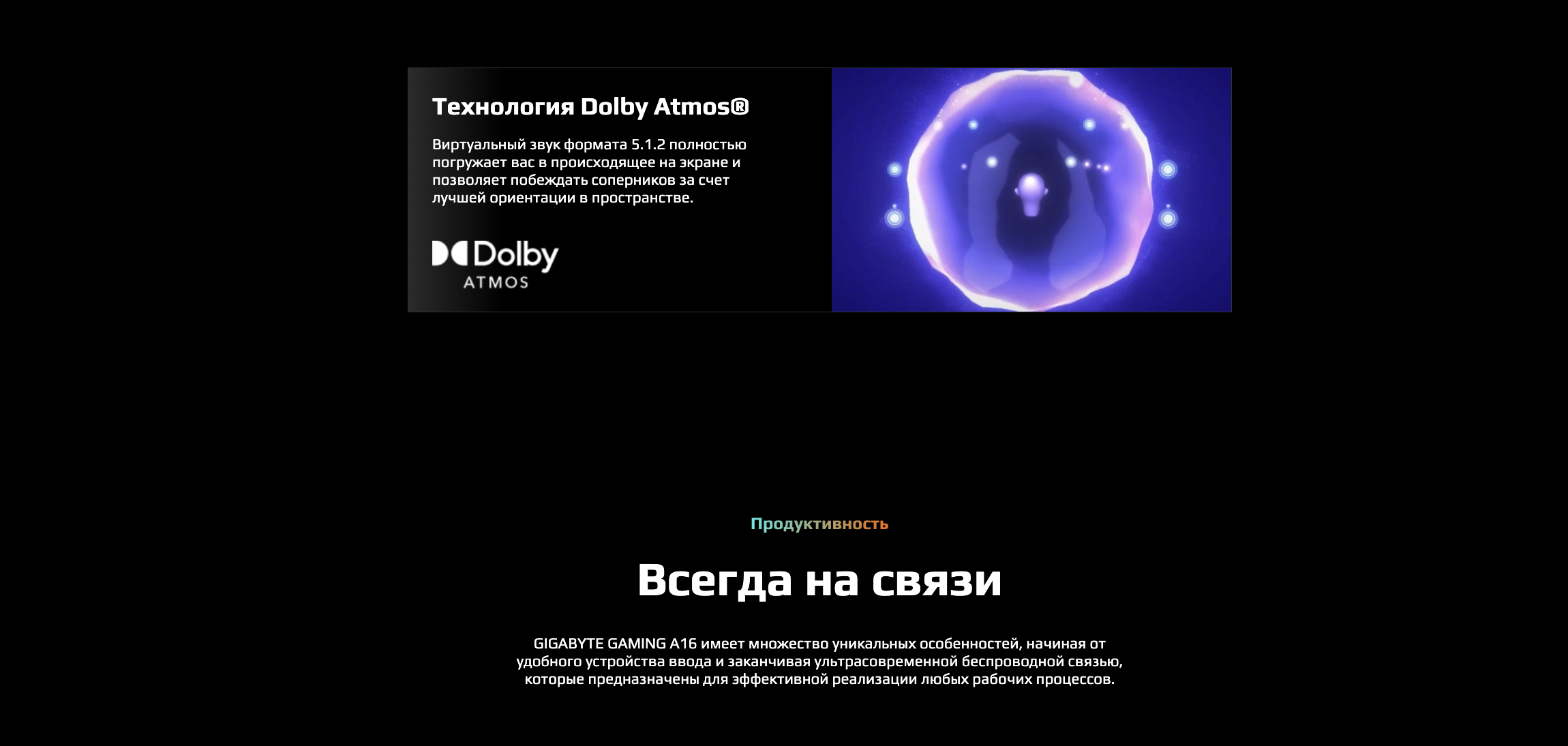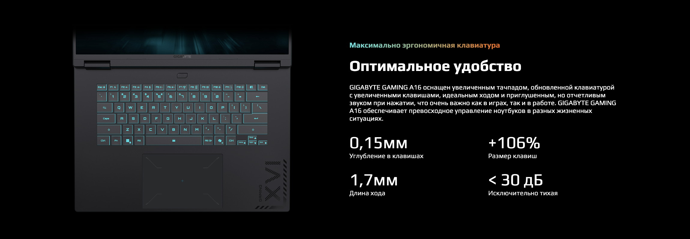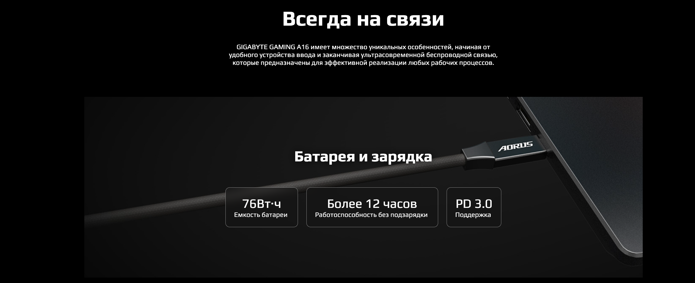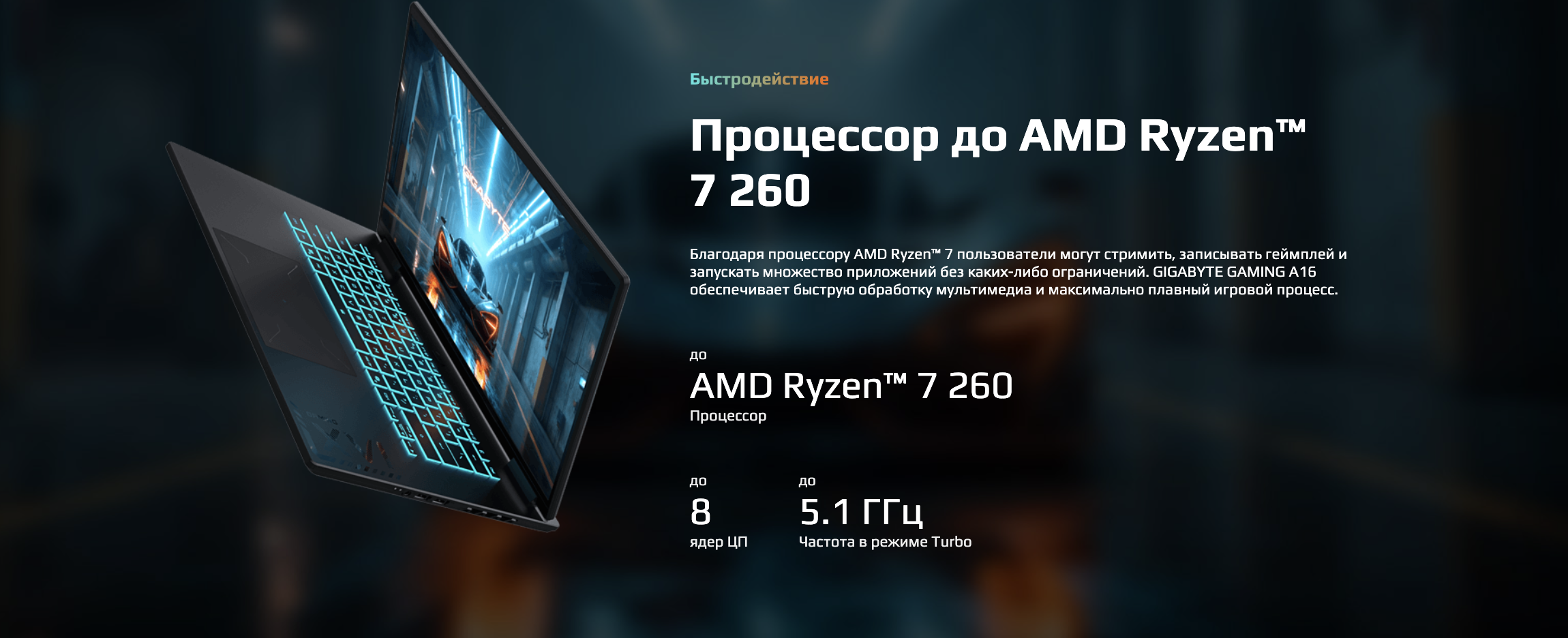 Представляем GIGABYTE GAMING A16 — игровой ноутбук для любого запроса. Он оснащён процессором AMD Ryzen™ 7 и видеокартой серии NVIDIA® GeForce RTX™ 50 для ноутбуков, обеспечивая высокую игровую производительность. Обновлённая клавиатура Golden Curve в тонком корпусе улучшает управление как в играх, так и в повседневной работе. Ноутбук не только позволяет наслаждаться объемным звуком благодаря технологии Dolby Atmos®, но и может раскладываться на 180 градусов. Быстрый. Лёгкий. Созданный для гейминга без ограничений.