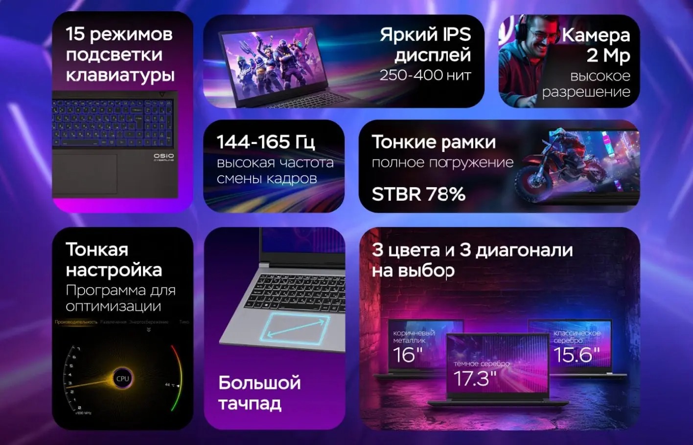 БрендOsio Диагональ экрана17.3 " Тип матрицы ноутбукаIPS Разрешение экрана1920 x 1080 Модель процессораIntel Core i5-12600H Модель видеокартыGeForce RTX 4050 Объем оперативной памяти16 Гб
