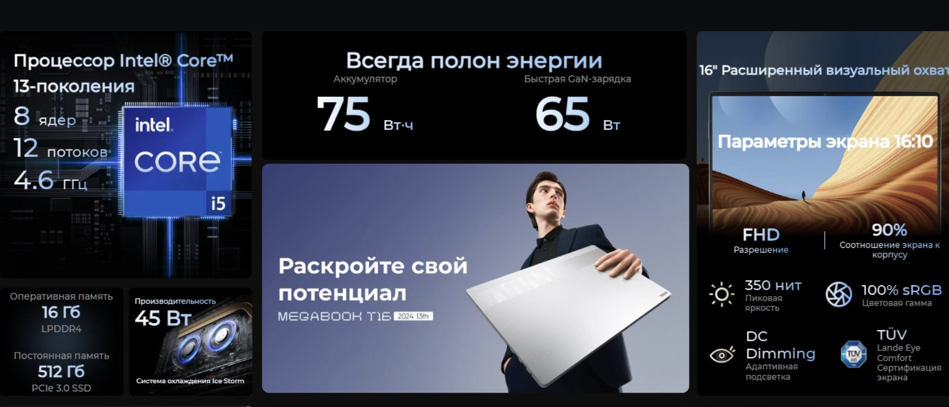 Характеристики Ноутбук TECNO MegaBook T16RA 16" Intel Core i5 13420H 16Gb SSD512Gb Windows 11 Home (4894947020971)