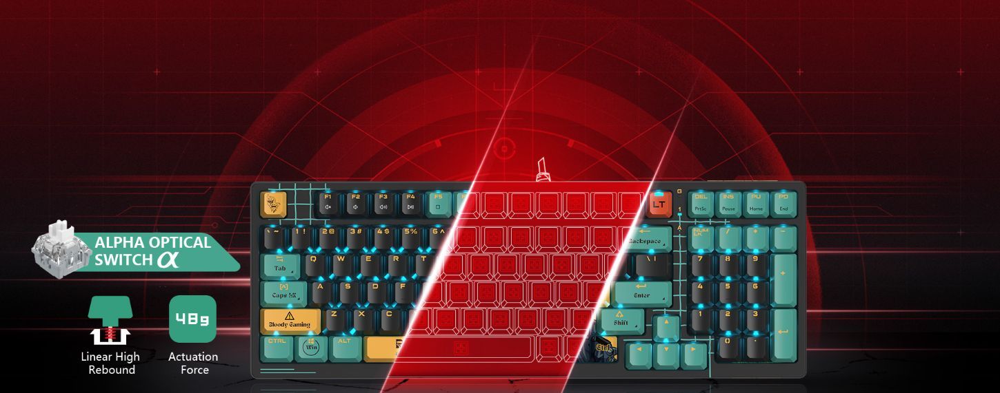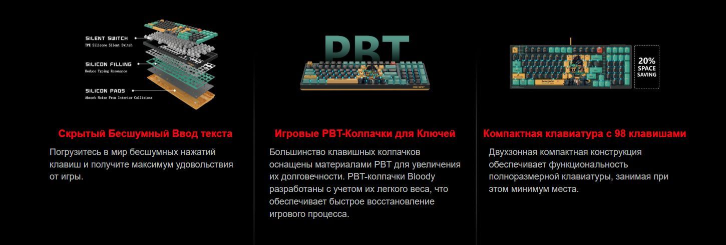 БрендA4tech Тип клавиатурыОптомеханическая Подсветка клавишЕсть Тип подключенияПроводная Цифровой блокЕсть Назначение клавиатурыИгровая Особенности клавиатурыКомпактная, Поддержка одновременных нажатий клавиш NKRO, Бесшумные клавиши, Раскладка клавиатуры ANSI, Материал кейкапов PBT, 98 клавиш, Линейные переключатели