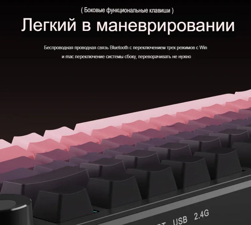 Беспроводное соединение. С возможностью беспроводного подключения через Bluetooth или 2.4G, клавиатура не создаст лишних проводов на вашем столе, обеспечивая большую свободу движений и удобство использования.