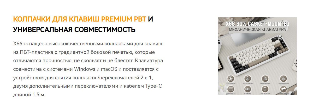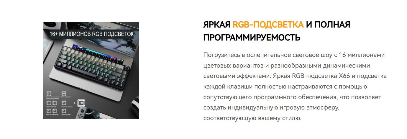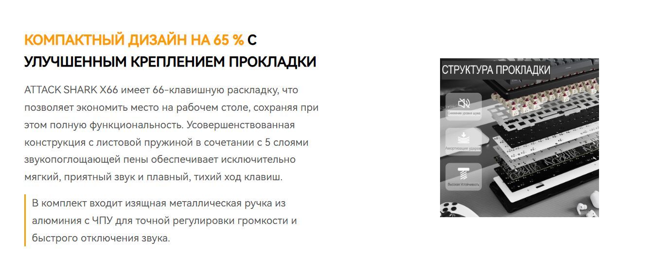 БрендAttack Shark Тип клавиатурыМеханическая Подсветка клавишЕсть Тип подключенияBluetooth, USB, радиоканал Цифровой блокНет Назначение клавиатурыИгровая Особенности клавиатурыВстроенная литиевая батарея, Раскладка клавиатуры ANSI, Материал кейкапов PBT, 66 клавиш, Регулируемая подсветка, Индивидуальная подсветка каждой клавиши, Линейные переключатели, Формат клавиатуры 65%, Программируемые клавиши, Поддержка одновременных нажатий клавиш NKRO, Double-shot
