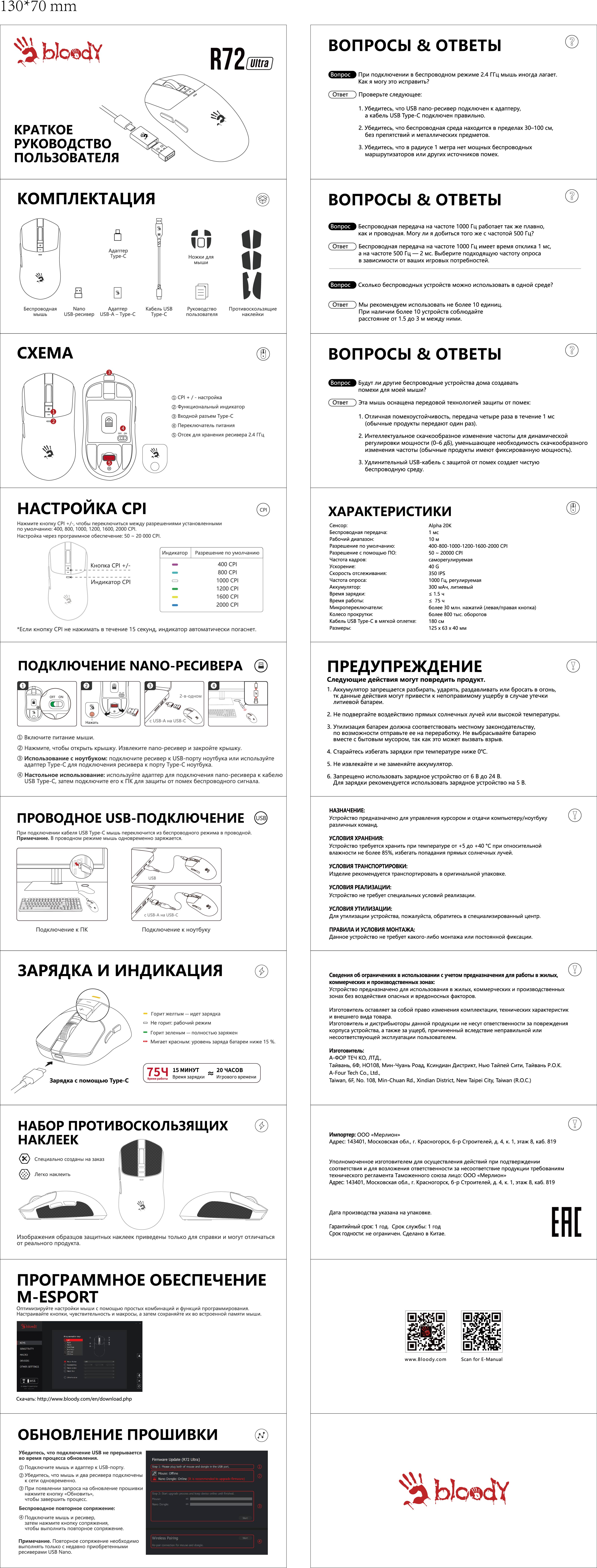 Мышь беспроводная/проводная A4Tech Bloody R72 Ultra – игровая модель с возможностью программирования клавиш для удобства управления. Тканевая оплетка защищает кабель от повреждений.