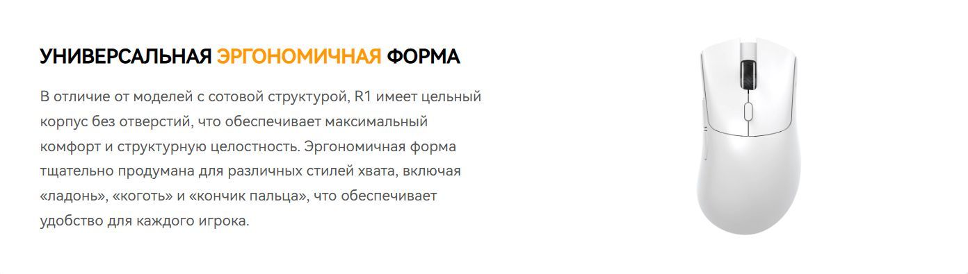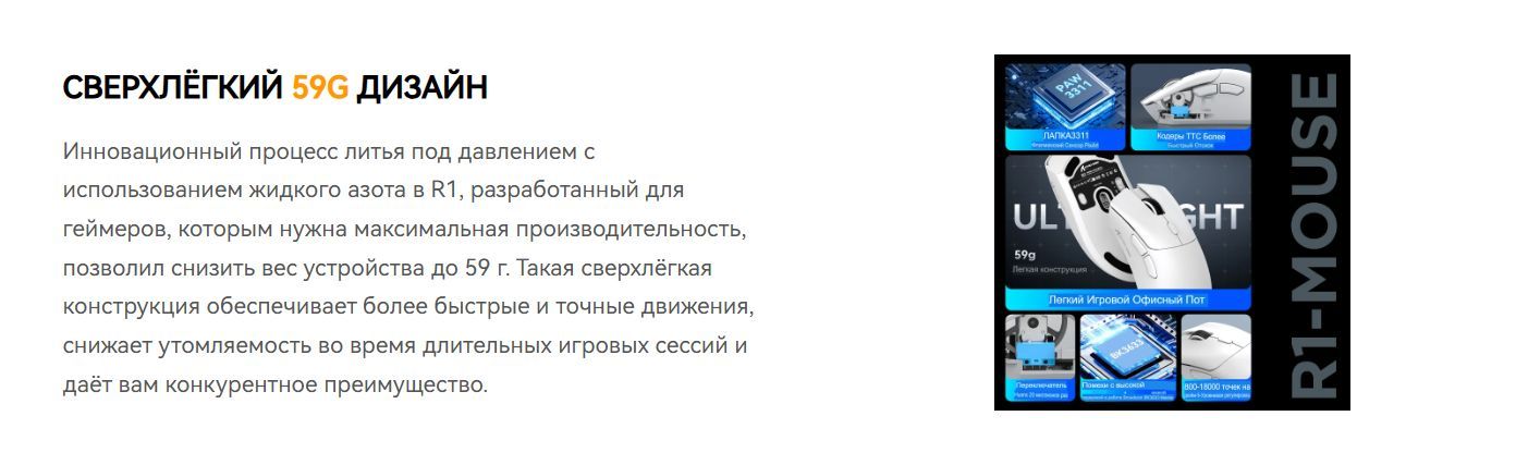 Сверхлегкая мышь R1 разработана для игроков, которые стремятся к максимальному весу.