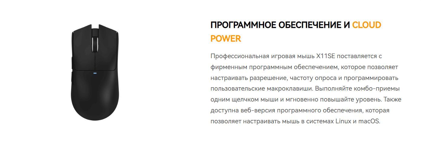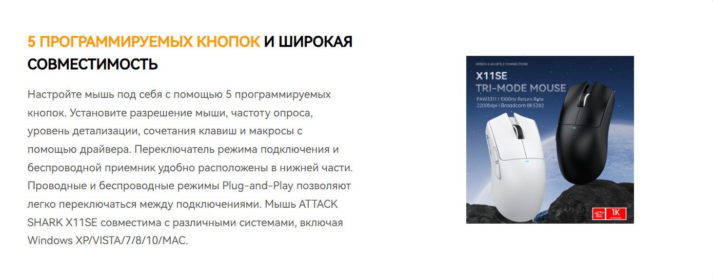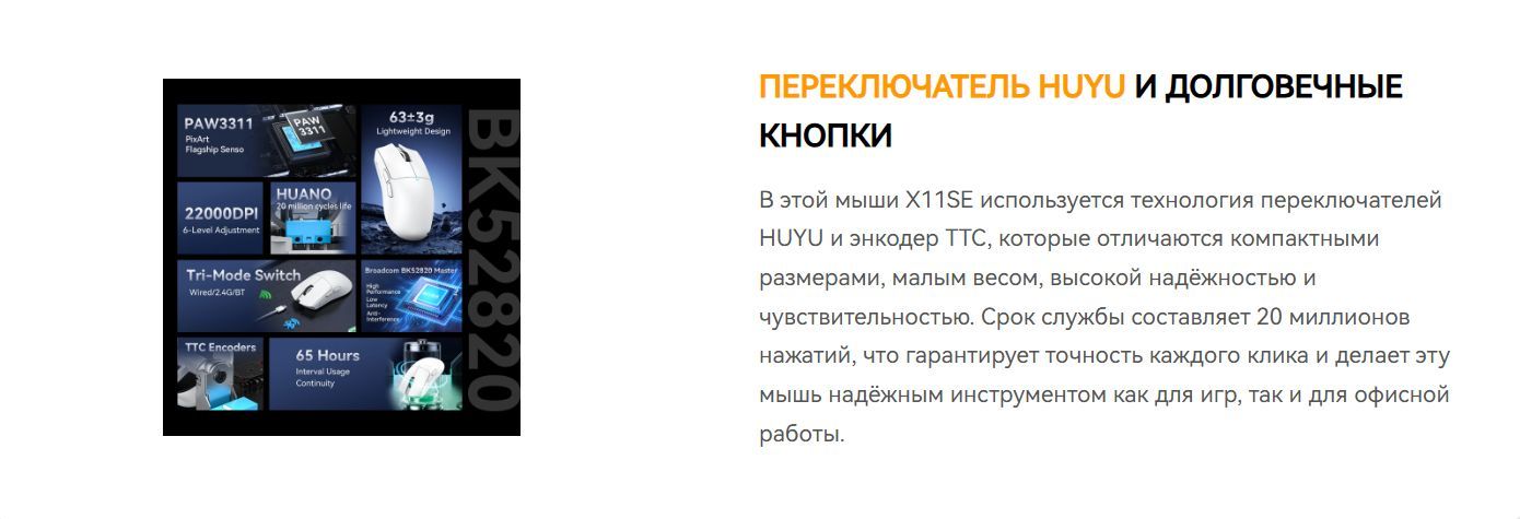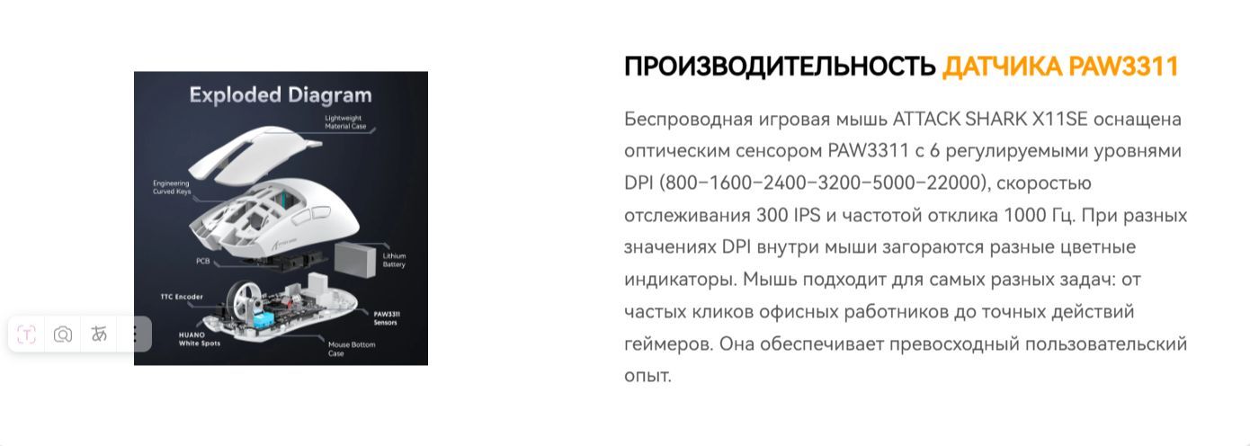 Игровая мышь Attack Shark X11SE оснащена флагманским сенсором PixArt 3311 с разрешением до 22 000 Dpi.