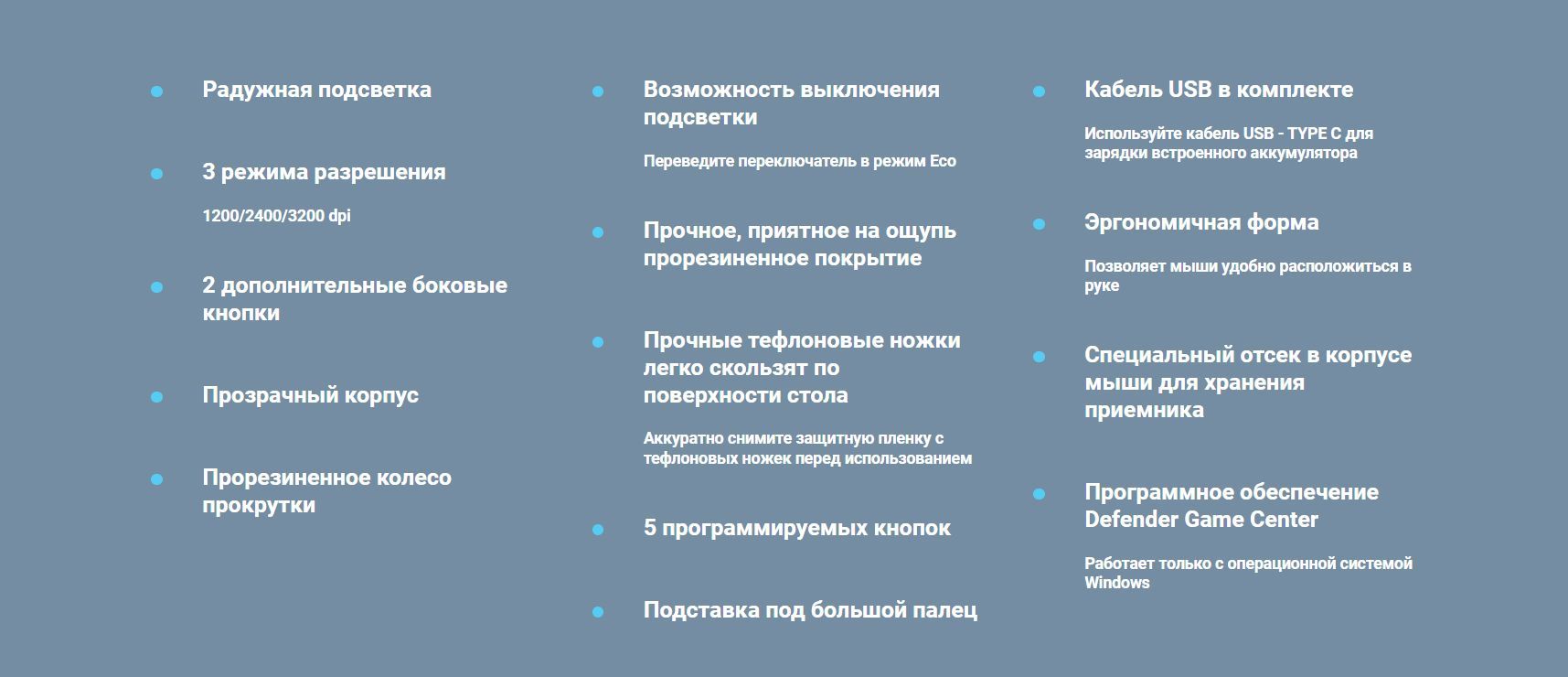 БрендDefender ТехнологияОптическая Интерфейс подключенияРадиоканал Тип соединенияБеспроводная Максимальное разрешение сенсора3200 dpi Количество кнопок6 Колесо прокруткиЕсть Радиус действия10 м ПитаниеОт собственных аккумуляторов Особенности мышкиЭргономичный дизайн, Прорезиненное покрытие, Кнопка смены разрешения, Боковые кнопки навигации «Вперёд» и «Назад», Специальное покрытие корпуса глянцевое, Программируемые кнопки, Встроенный аккумулятор, Тефлоновые ножки для лучшего скольжения, Прорезиненное колесо, Для правой руки