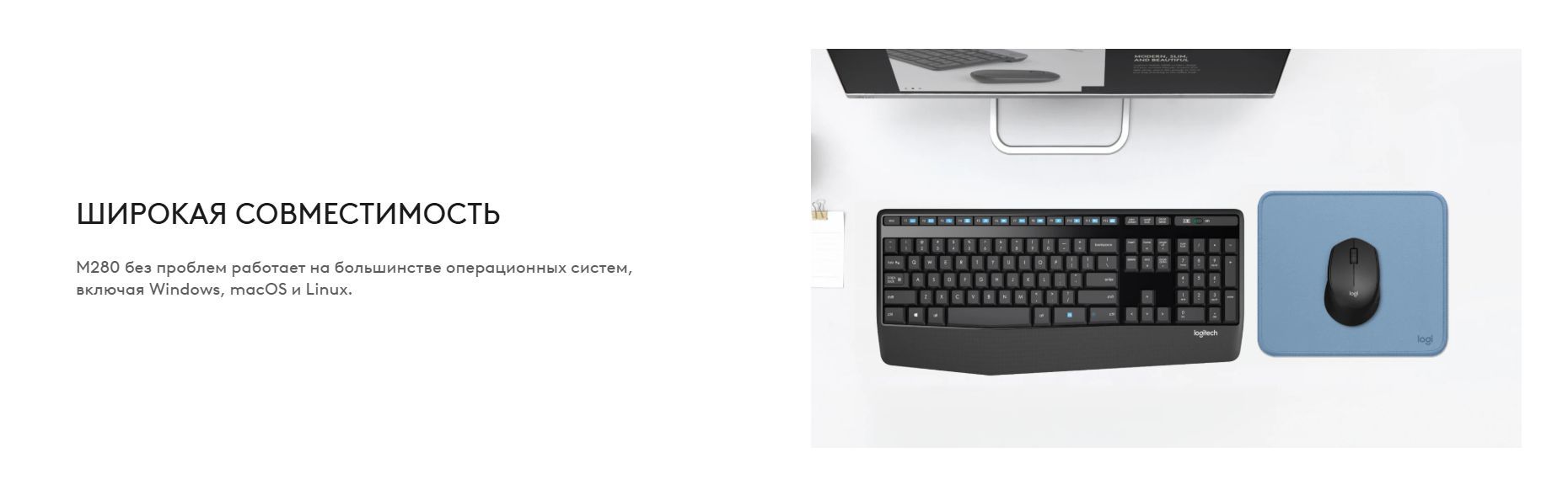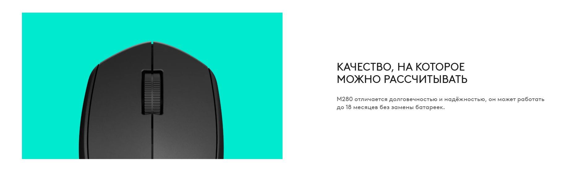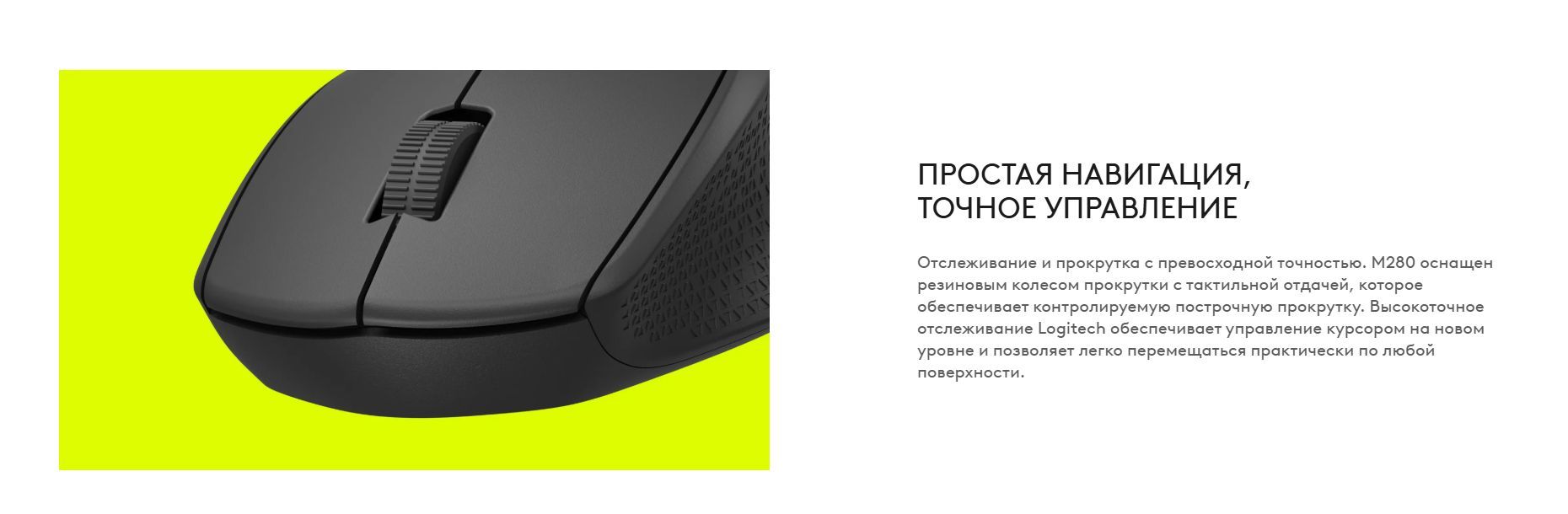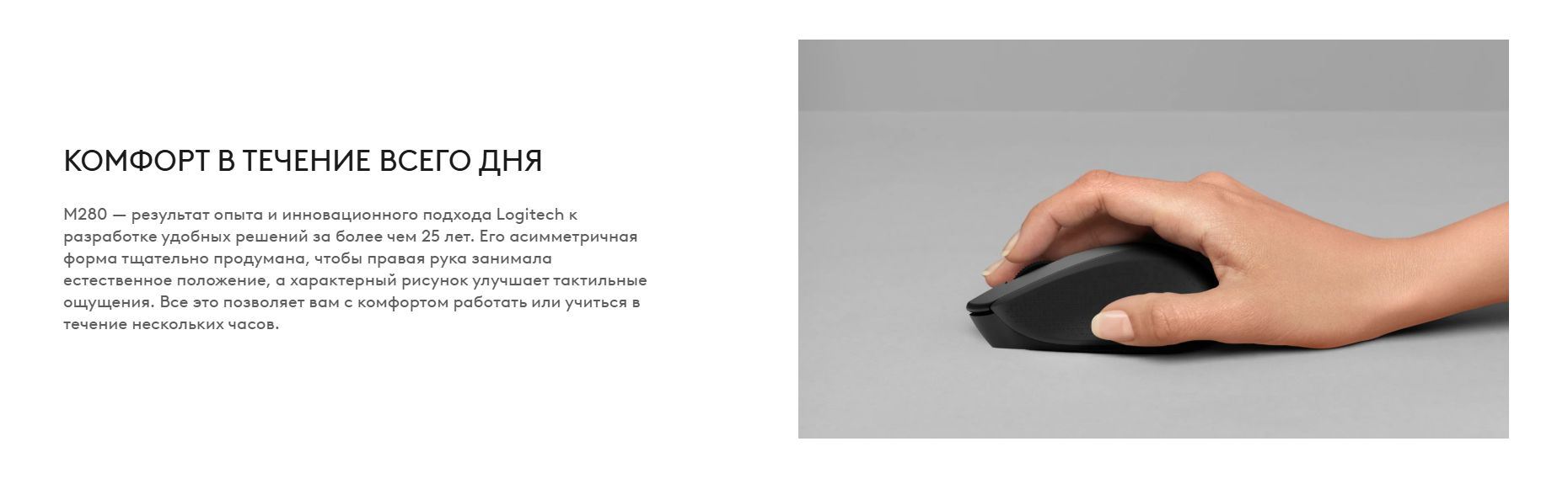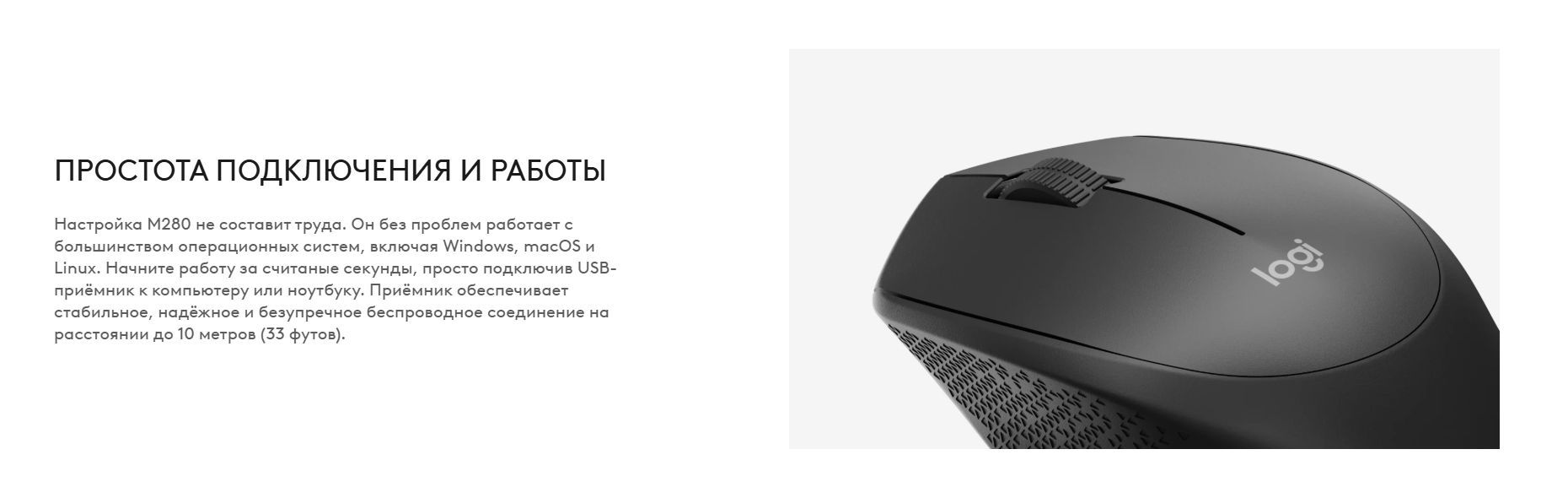 Беспроводная мышь Logitech M280 позволит с комфортом расположиться за компьютерным столом любых размеров благодаря радиусу действия беспроводной связи, достигающему 10 метров.