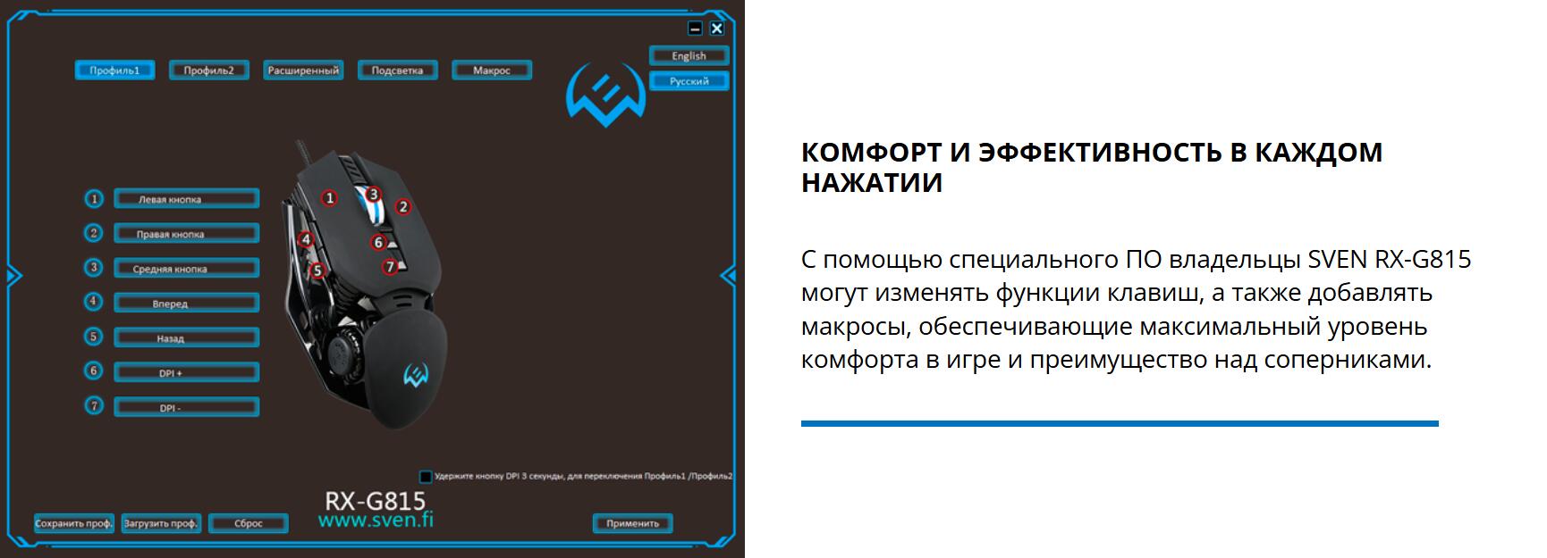 Что же делать? Все очень просто — надо оснастить мышь максимумом функций, а также дать пользователю возможность гибко настраивать самые важные параметры. Именно по этому пути пошли инженеры компании SVEN, разрабатывая программируемую SVEN RX-G815.