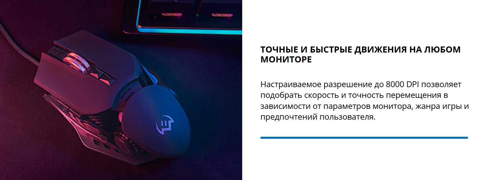 Разрешение сенсора меняется в широчайших пределах от 500 до 8000 DPI — свой режим можно подобрать под любое разрешение монитора, желаемую скорость перемещения и точность позиционирования указателя.