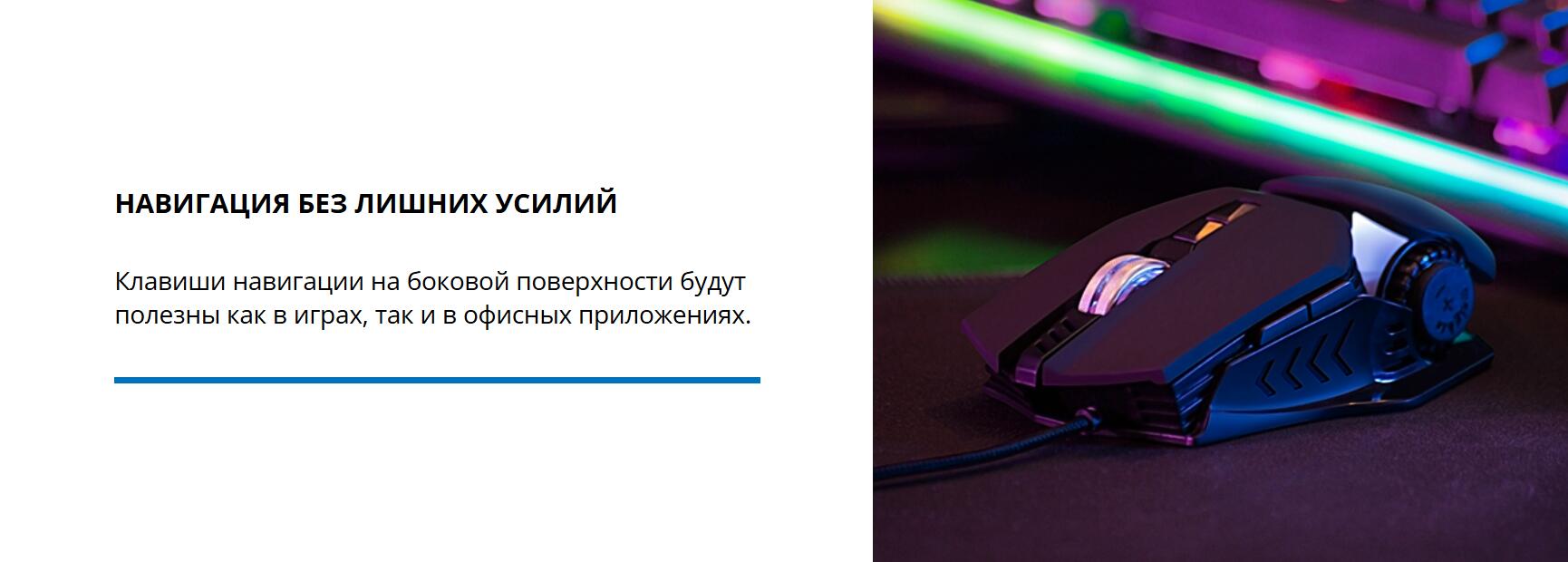 У мыши 6 настраиваемых клавиш, плюс нажимаемое колесико — в том числе, есть боковые кнопки навигации, которые помогут не только в играх, но и в работе или учебе.