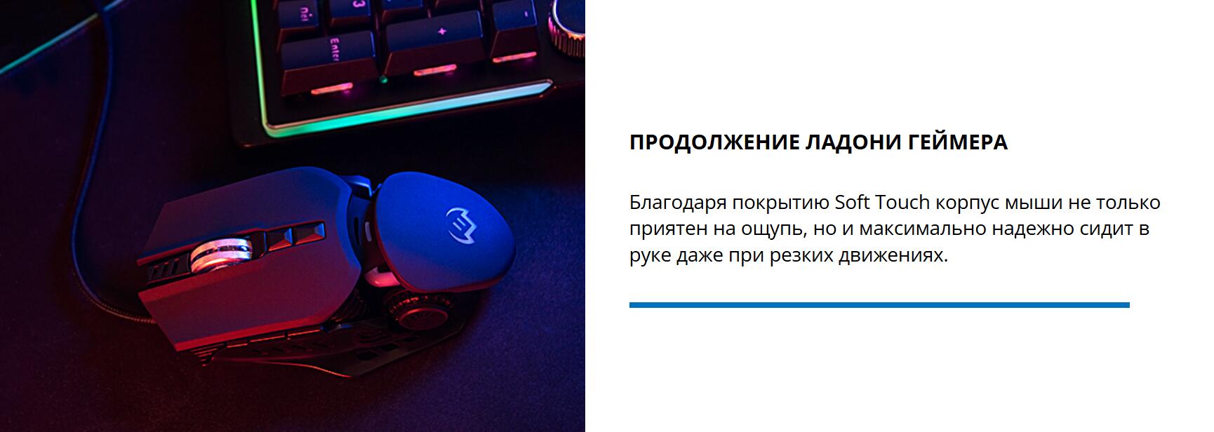 Но даже это еще не все. Благодаря эргономичной форме и покрытию Soft Touch RX-G815 удобно лежит в руке и обеспечивает не только возможность продолжительной игры, но так же приятные тактильные ощущения и более надежный контакт с рукой геймера.