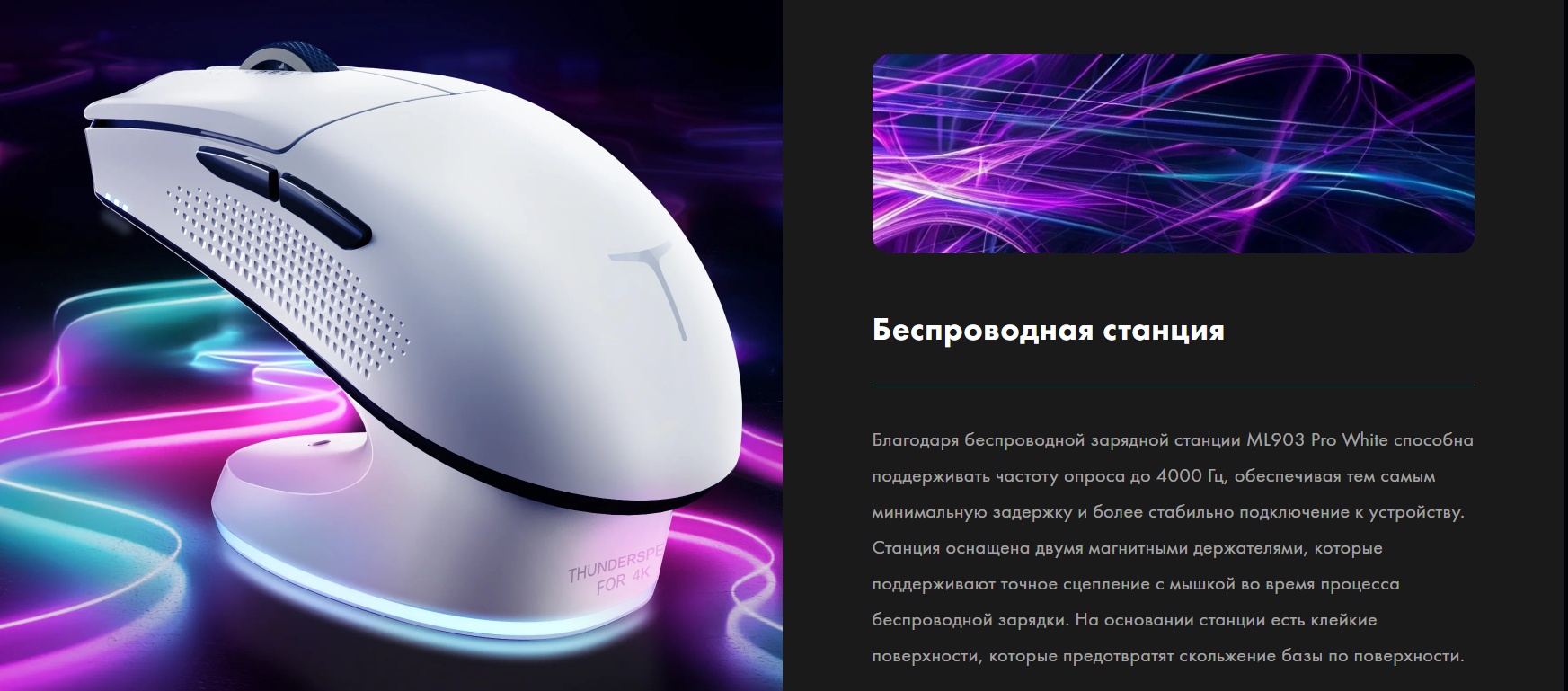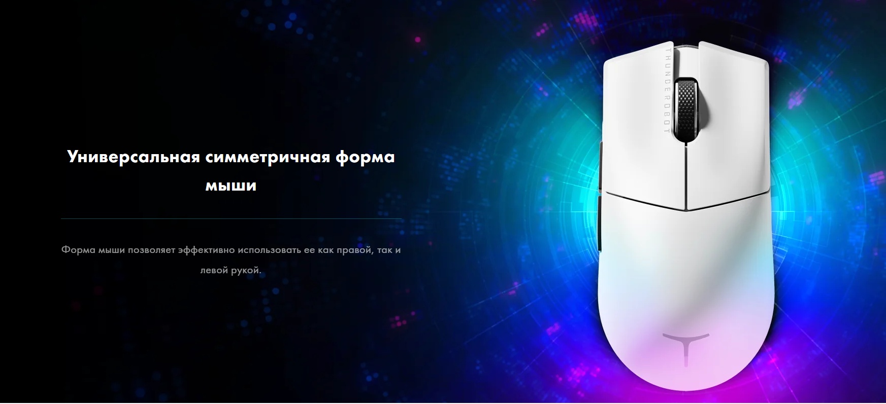 БрендThunderobot ТехнологияОптическая Интерфейс подключенияBluetooth, Радиоканал, USB (проводной) Тип соединенияПроводная/беспроводная Максимальное разрешение сенсора26000 dpi Количество кнопок5 Колесо прокруткиЕсть Радиус действия10 м ПитаниеПо шине Особенности мышкиДля правой и левой руки, Прорезиненное колесо, Нулевое сглаживание, PAW PixArt 3395, Максимальное ускорение 50 G, Боковые кнопки навигации «Вперёд» и «Назад», Док-станция, Частота 4000 Гц, Эргономичный дизайн, Тефлоновые ножки для лучшего скольжения, Программируемые кнопки, 650 IPS