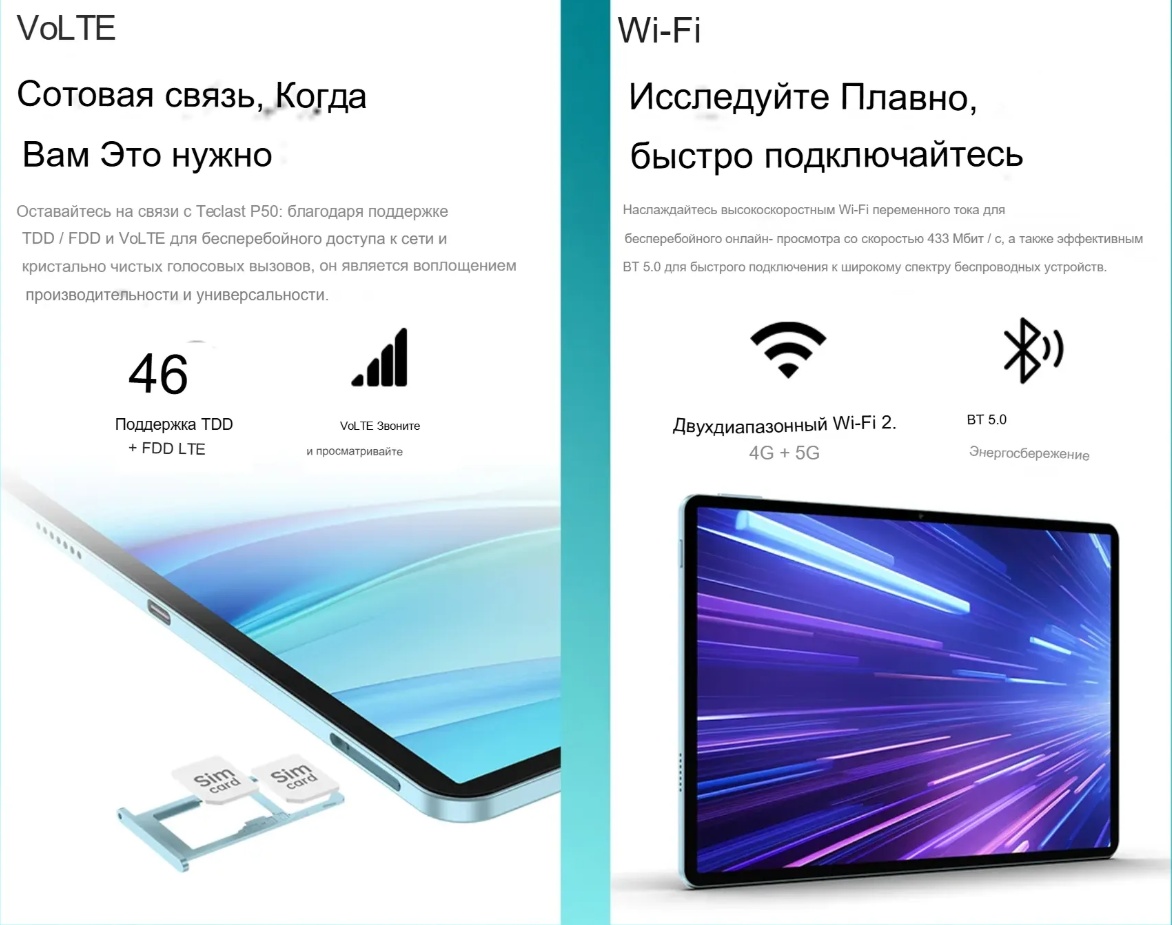 Планшет Teclast P50 создан для полной свободы общения и подключения. Он поддерживает работу с двумя сим-картами стандарта нано-сим, что позволяет всегда оставаться на связи благодаря встроенным модулям мобильной связи третьего и четвертого поколений.