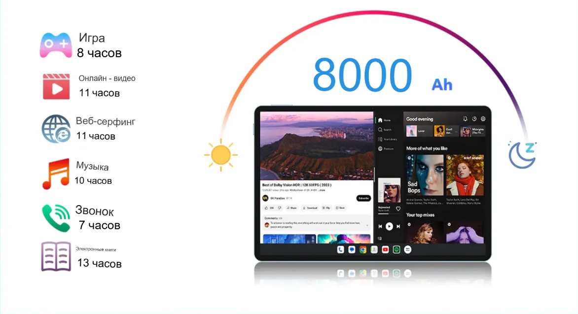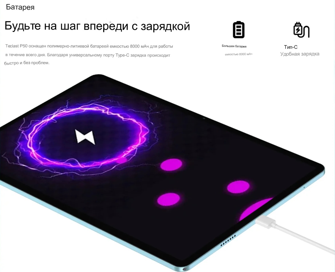 Не стоит беспокоиться и о автономности. Огромная батарея емкостью 8000 мАч гарантирует, что планшет будет работать весь день без подзарядки, даже при активном использовании.